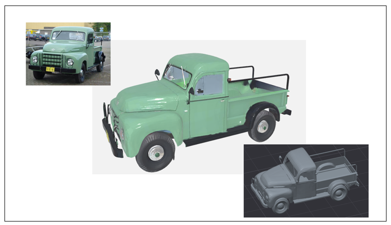 Ik heb daarnet een 2D 640x480 pixels plaatje van een DAF33 geupload en dan komt dit in 3D eruit: