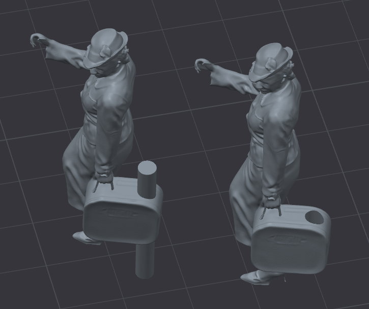 Hierboven het resultaat. Ik heb hetzelfde vrouwtje gebruikt. Ze mist een been en haar koffer klopt niet. Maar dat komt door het 2D/3D programma. Links heb ik een paal toegevoegd door de te brede koffer, rechts heb ik er een gat in geboord.
