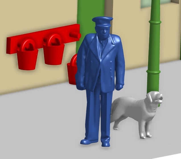 Terug naar het "mixed-modeling" met Onshape. Vanwege mijn werkzaamheden bij het DAF Museum beschik ik over het professionele ontwerpprogramma Vizcom. Ik heb een paar foto's met dit programma bewerkt. Een Britse spoorbeambte en een labrador. Beide zijn goed geïmporteerd in Onshape. En ik kan ze nu zelfs toepassen in assemblies van eerdere ontwerpen. Precies zoals ik al eerder zei... een gefotografeerd ornament toevoegen aan een CAD ontwerp.