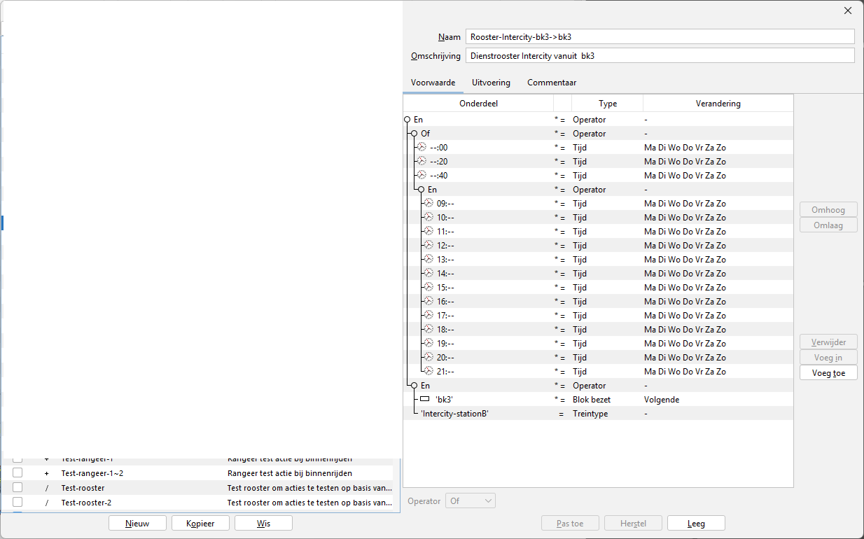 John, ik gebruik zelf veel tijd acties in Itrain om dienstroosters te maken. Ik heb getracht om een voorbeeld van het voorwaarde venster hier te plaatsen. Hopelijk is dit voor jouw bruikbaar.