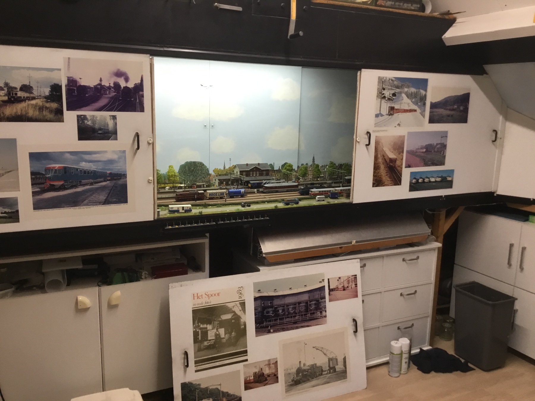 Ik heb erover nagedacht om boven de modelspoorbaan een opgerolde markies (zoals voor een balkon) te installeren. Maar ik kan die niet uitrollen om in de betonnen muur erachter te boren.