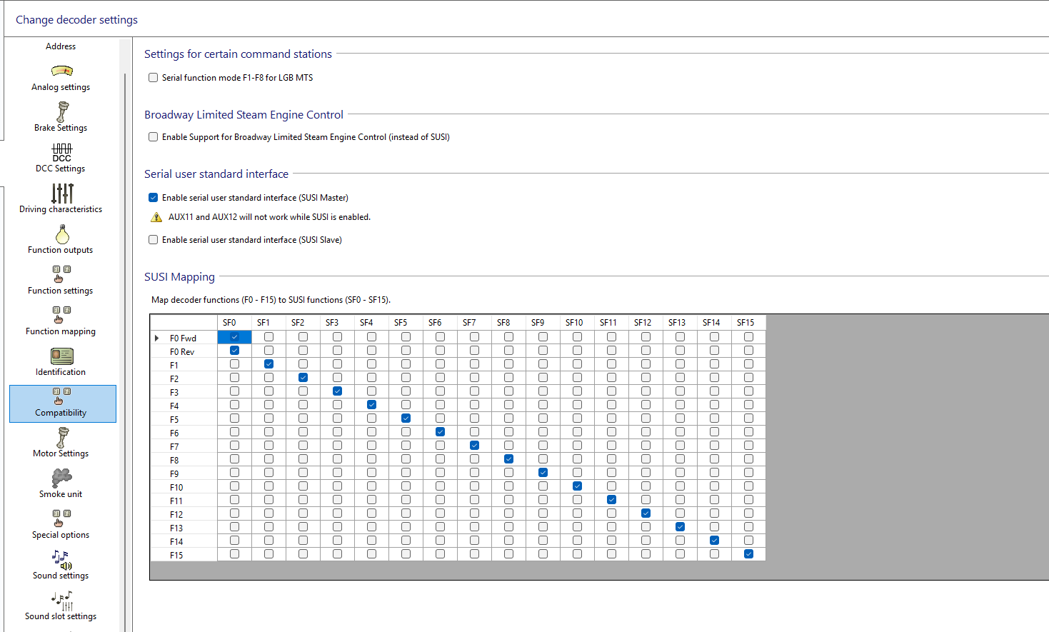 Het is helaas zoeken welk bevel (SF0 t/m SF15) wat doet. Dat probleem had ik met de DE18 van Piko.