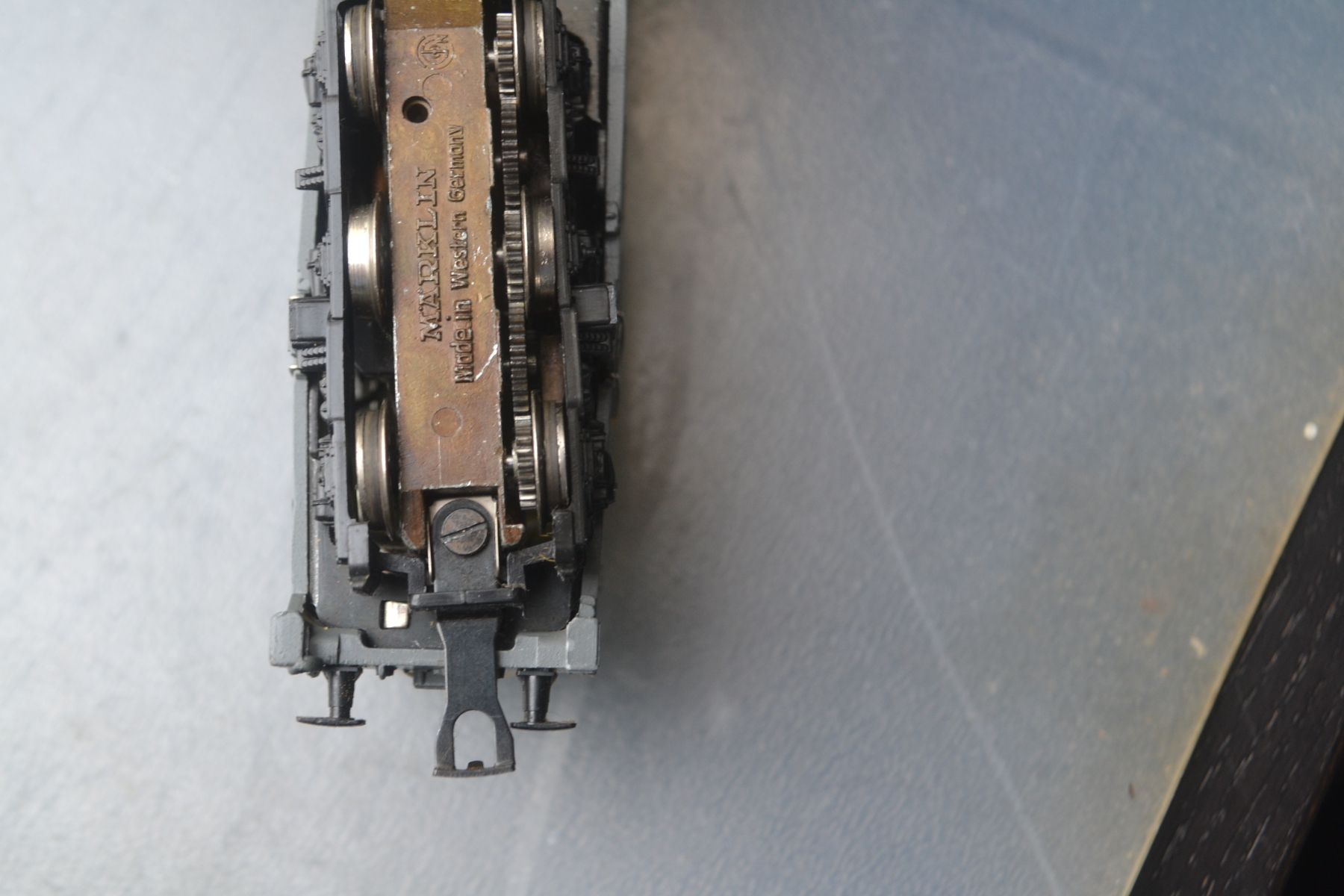 De Märklin-haak wordt op zijn plek gehouden door de grote schroef die je ziet op het draaistel thv de koppeling. Daarmee wordt ook de draaistelomkant bij elkaar gehouden. Er zit ook een messing spacer tussen. Destijds was het fenomeen NEM-schacht nog niet (bij Märklin) bekend, dus verwisselen voor een andere koppeling wordt een puzzeltje of vergt creativiteit. Bellejt geeft je een link naar mogelijkheden voor een aantal Duitse Märklin-modellen. Wellicht past er iets. Ik durf niet te zeggen welke andere opties er zijn voor jouw loc specifiek. Ik zou het zo laten.
