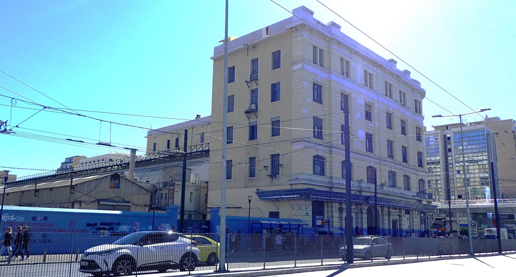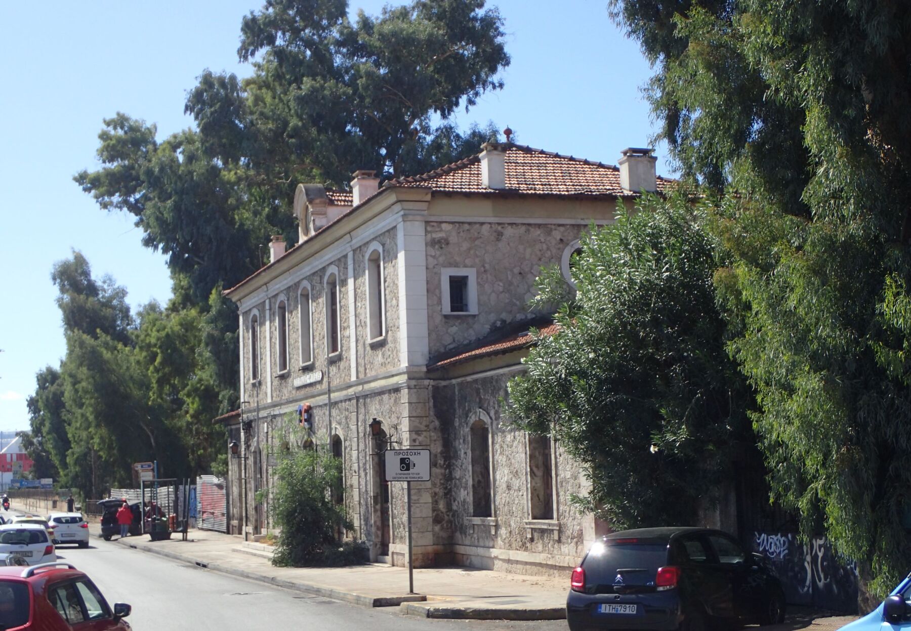 Het oude treinstation van Piraeus, Het station, bestaat uit een centrale structuur van twee verdiepingen, geflankeerd door twee vleugels van één verdieping en met daarachter een grote loods, dokken en spoorlijnen.