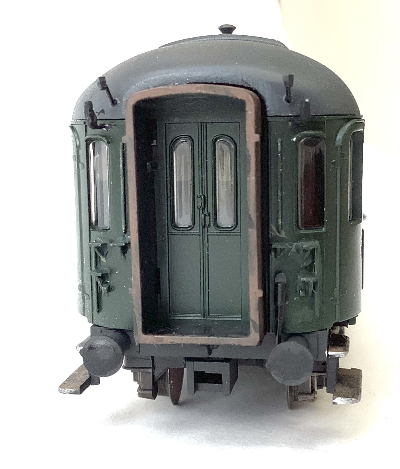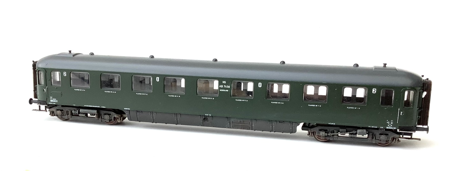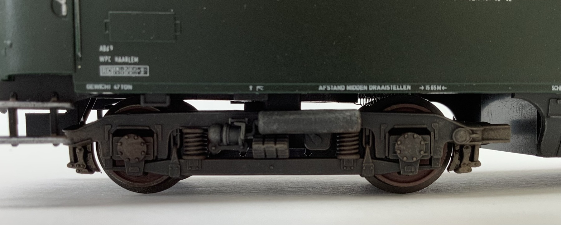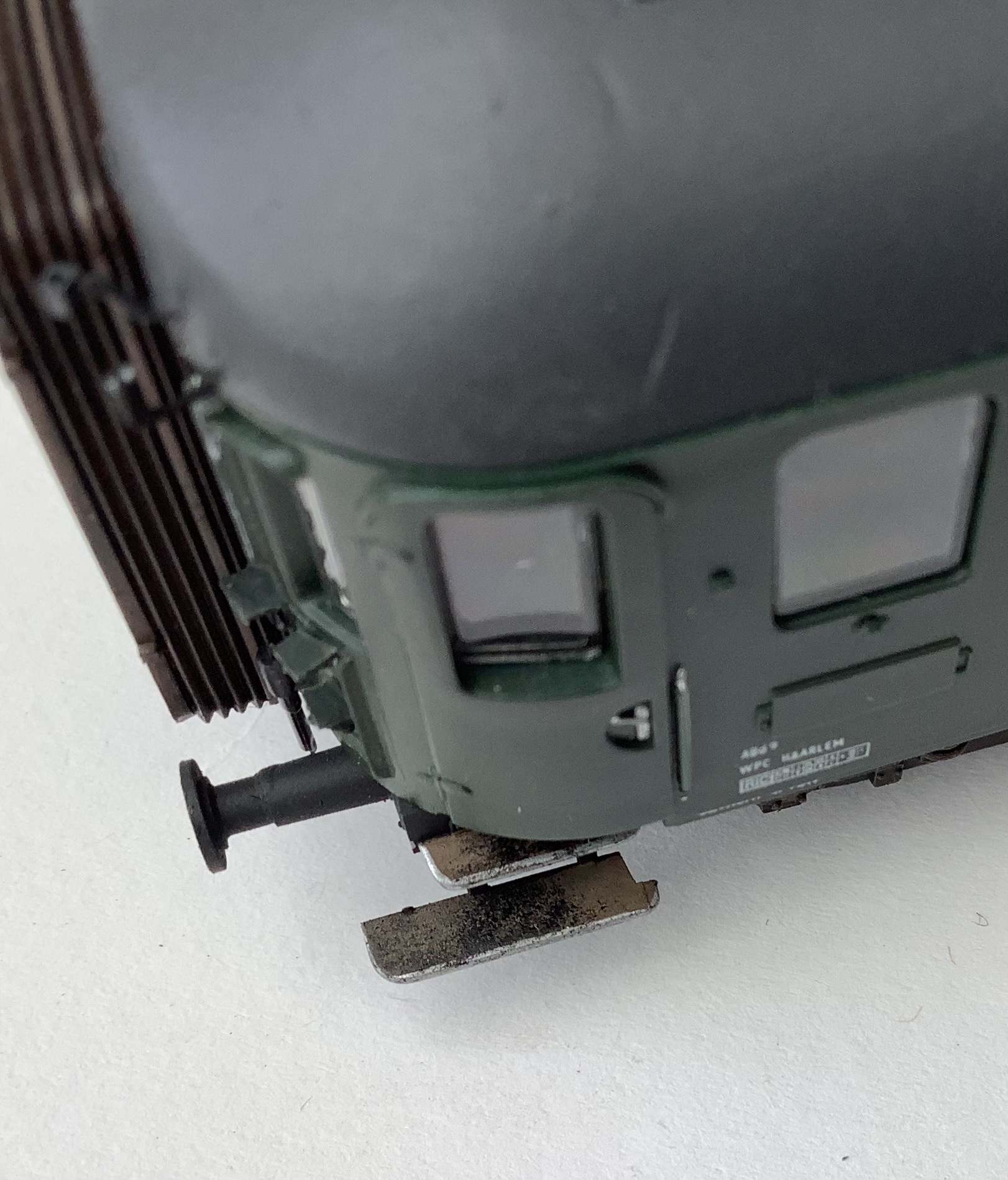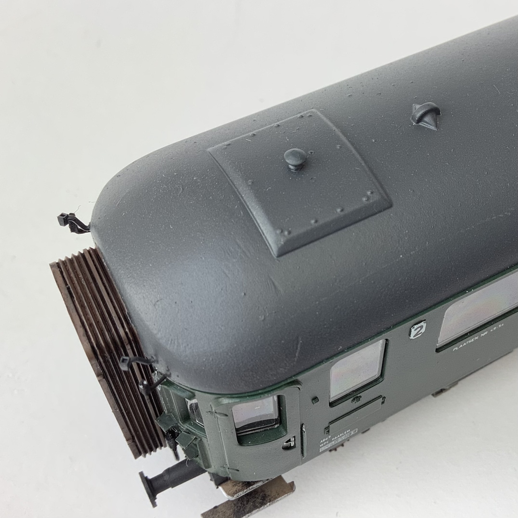 Heel kenmerkend bij die rijtuigen waren de opstaptreden op de koppen van het rijtuig, drie stuks aan weerszijden van de vouwbalgen. Met een grove schatting kwam ik op 1,5 x 1,5 mm. En dat maal 12 maar, door ervaring wijzer geworden, heb ik er met mijn onnavolgbare chopper een aantal extra gehakt, want die dingen willen nog wel eens verdwijnen. En dan het moment suprème: het daadwerkelijk aanbrengen van die kleine dingen. Er zijn wat niet te herhalen krachttermen geuit, maar uiteindelijk is het allemaal toch gelukt. De makke is een beetje dat de koppen van de originele Roco model behoorlijk afwijken van het grote voorbeeld (let wel: inmiddels bijna 50 jaar oud en het wordt nog steeds onveranderd verkocht als warm brood), dus het is af en toe een beetje smokkelen, maar het uiteindelijke resultaat is een best wel aardig bakkie. Het dak, de bodemplaat en de draaistellen heb ik opnieuw gespoten, het dak donkergrijs, de draaistellen en de bodemplaat mat antraciet. De laatste twee heb ik na droging wat gedrybrushed met dry earth en dust om de details wat op te halen.