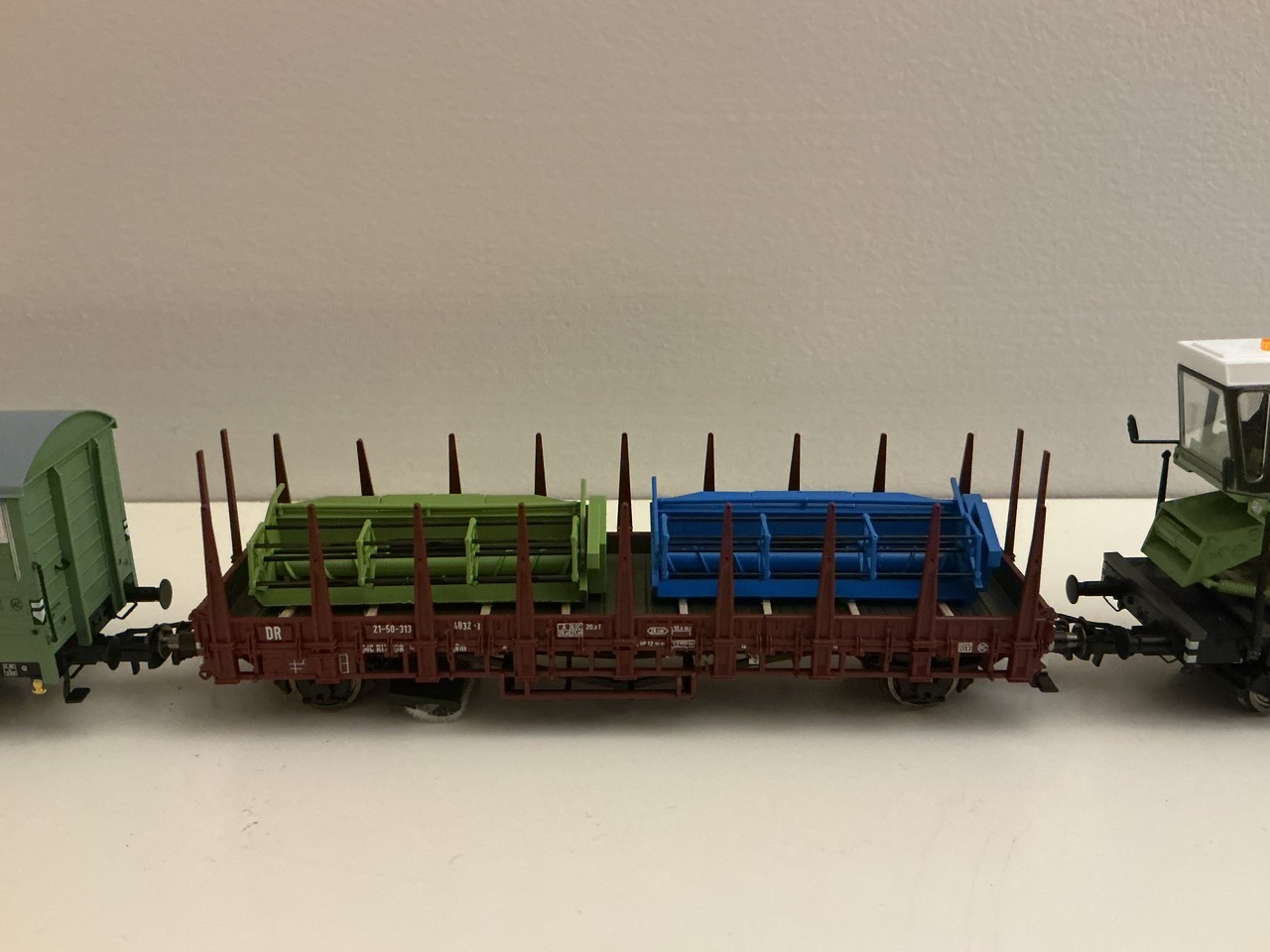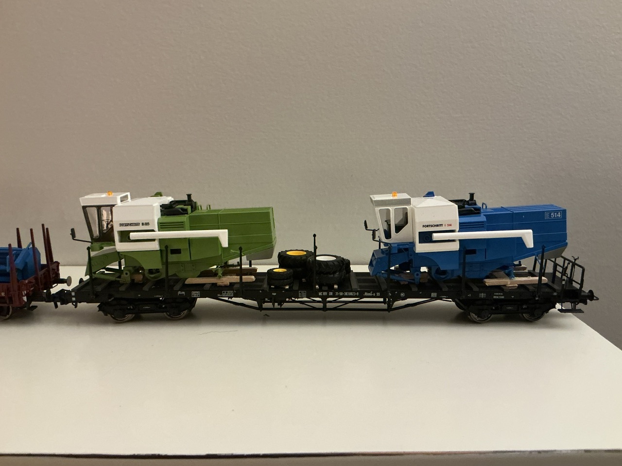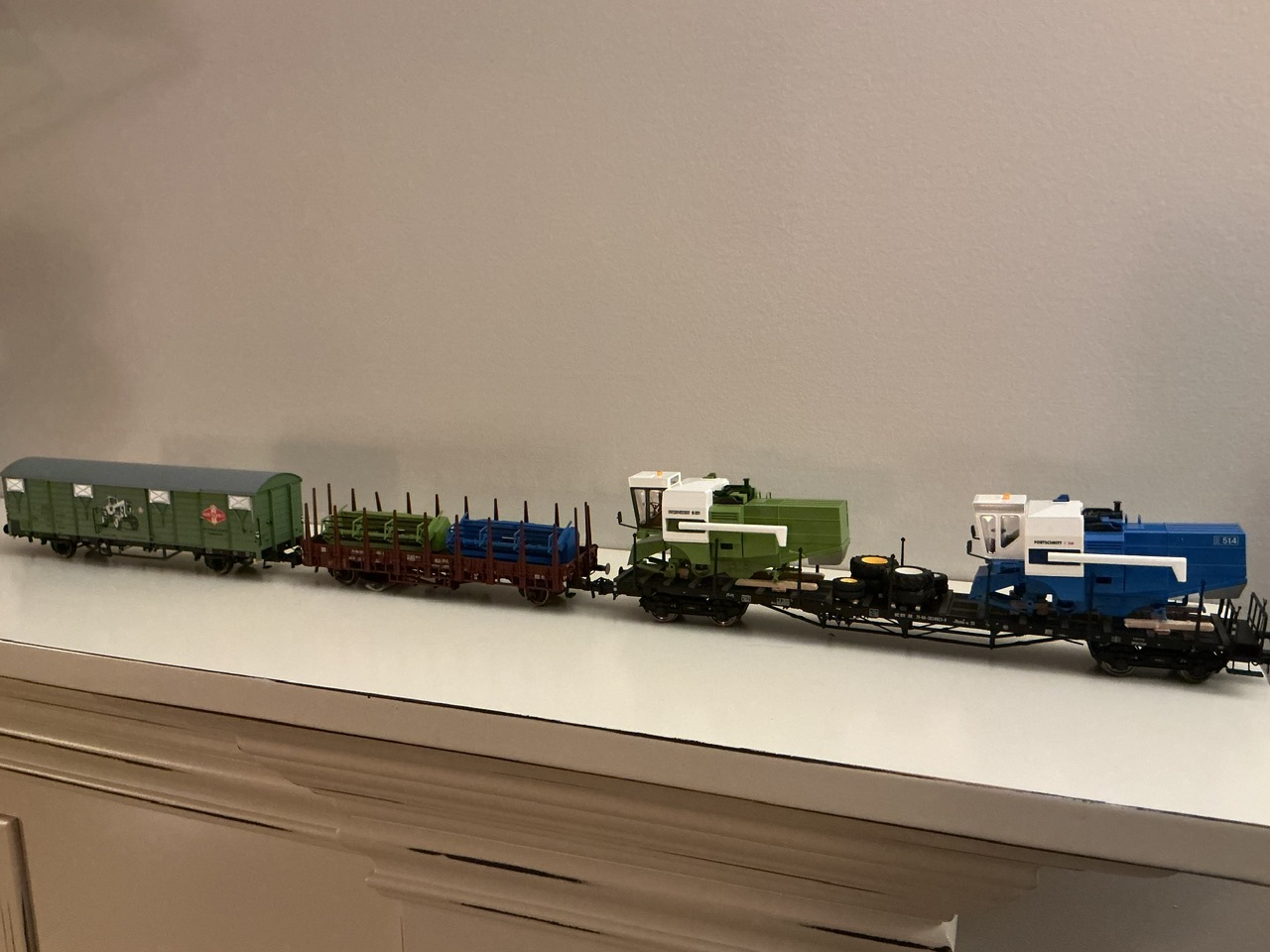 Dit is het geworden een blauwe en groene combine op een 4assige wagen in DR uitvoering van Brawa de 2 headers in een DR rongenwagen van Piko en nog een Brawa DR gesloten wagen met Forschritt opschriften.