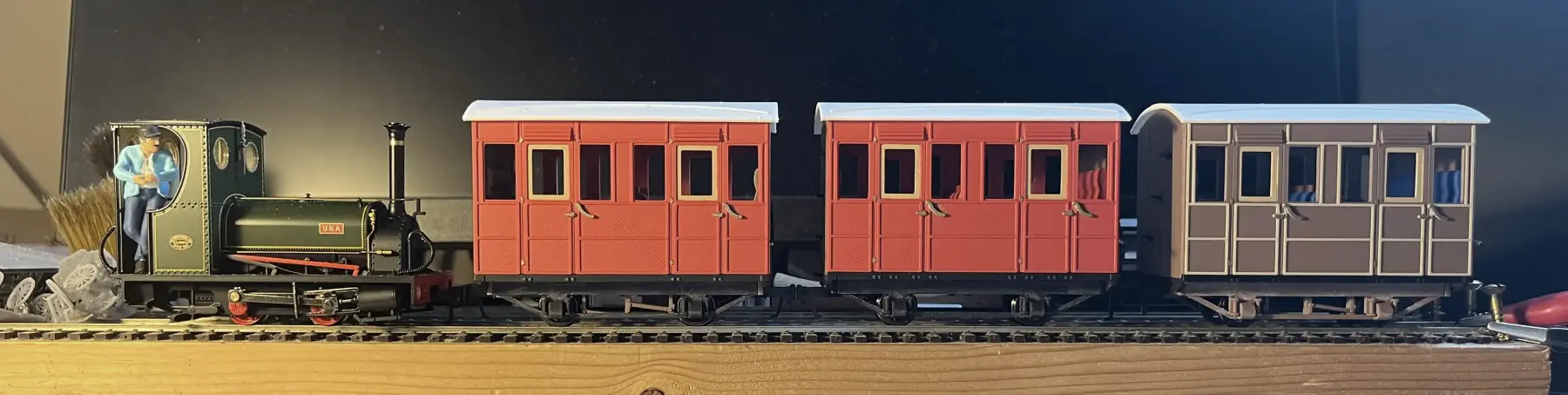 Una heb ik ook, prachtig model. Ik heb er wat Glyn Valley Tramway rijtuigjes voor geprint met de PLA printer. Bestand is gratis te downloaden op Thingiverse. Als je baan klaar is moet ik maar bij je komen rijden, want ik heb er zelf geen baan voor liggen. Beetje uit de hand gelopen experiment.