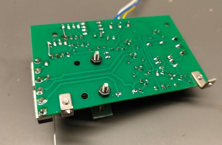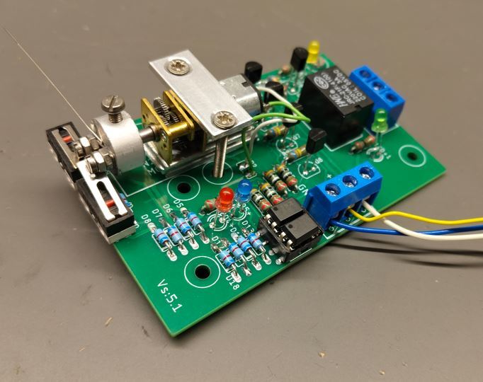 Inmiddels heb ik de electronica wat uitgebreid, de ingang heeft een optocoupler gekregen zodat de voeding van de motor nooit de uitgang van de decoder kan beschadigen. Tevens hoeft de spanning voor de motor dus niet gelijk te zijn aan die van de decoder. Op het printje zit inmiddels ook een relaistje om het puntstuk te schakelen, wat ledjes geven aan wat de motor aan het doen is, en het is zelfs mogelijk om de motorspanning te verlagen als de motor nog steeds te snel blijkt te draaien.