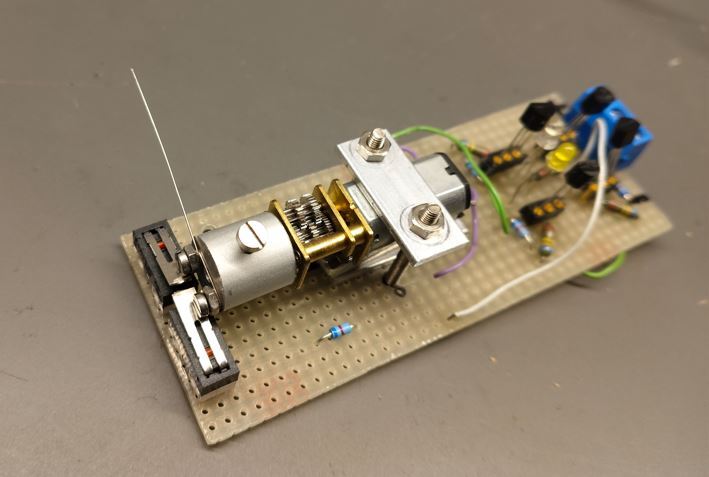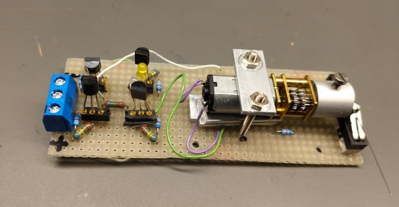 Dit is niet helemaal het eerste prototype trouwens, deze heeft al transistors en het 1e prototype had alleen maar microswitches. De transistors vormen een H-brug waarmee de motor linksom en rechtsom gestuurd kan worden. De slag die motor maakt wordt grotendeels bepaald door de hoogte van de motor tov de microswitches. Hoe hoger de motor zit, hoe verder de motor moet draaien voor ie de microswitch indrukt.