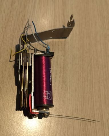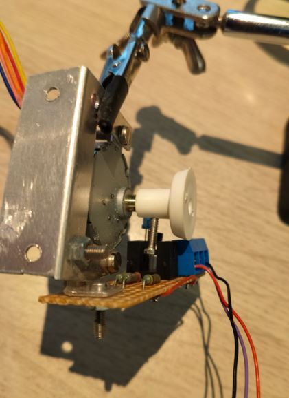 Op de as van de motor zit een rond stukje aluminium waarop de verenstaal draad zit die het wissel laat bewegen. De schroefjes waarmee deze draad vastzit drukt ook gelijk de microswitches in.