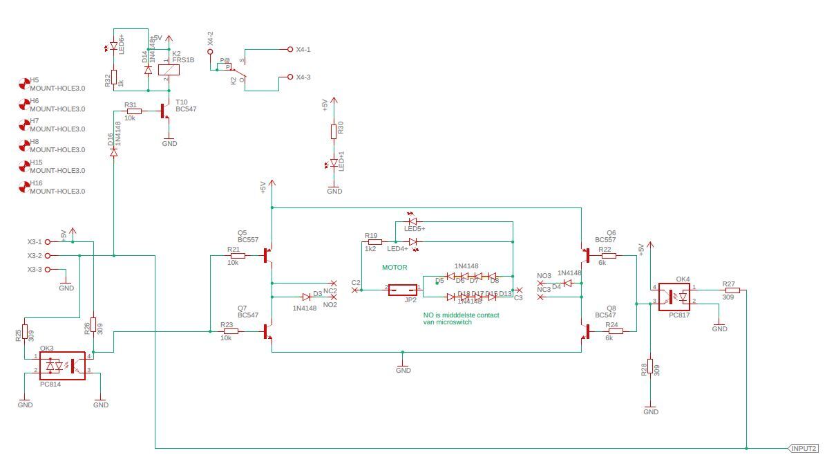 Zoals op de print te zien is is dit versie 5 inmiddels, het ging niet allemaal in 1 keer goed zullen we maar zeggen. Maar inmiddels doet de print exact wat ik wilde. Een enkele hoog/laag ingang, voeding 5V, stroomverbruik nihil, puntstuk schakeling, langzaam, stil en zeker niet duur.