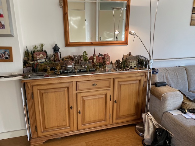Wie weleens bij mij thuis is geweest, heeft de spoorbaan langs de woonkamerwand zien lopen. Treinen pendelen van kamer naar keuken en terug. Op het dressoir heb ik wat scenery staan.