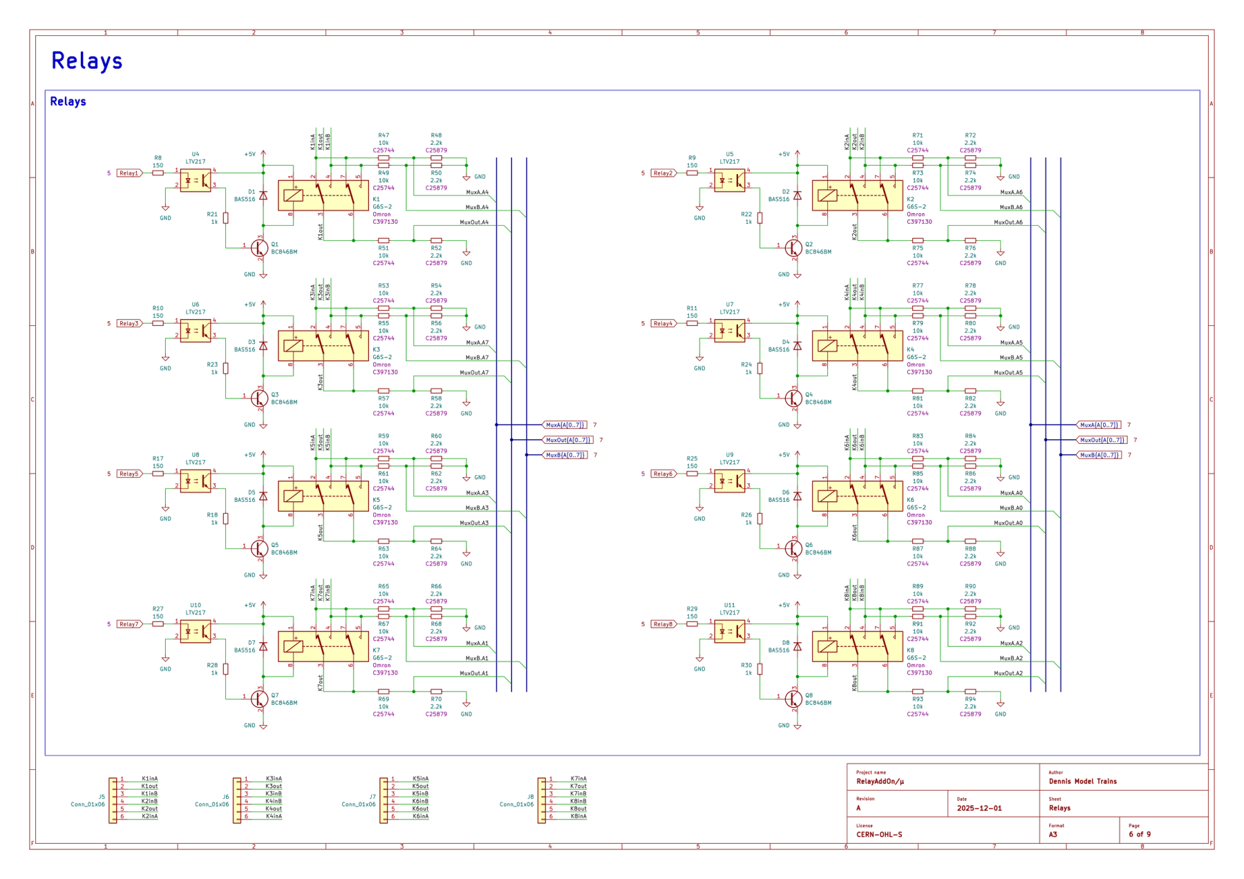 Hier een plot van het relevant gedeelte van mijn schema (moet sommige dingen nog even netjes maken, zoals de connectors onderaan de pagina en het artikelnummer en JLCPCB-nummer bij de relais klopt ook niet):