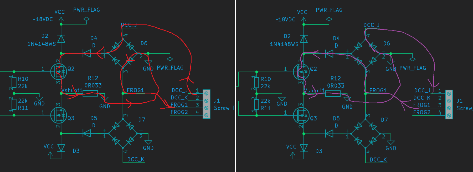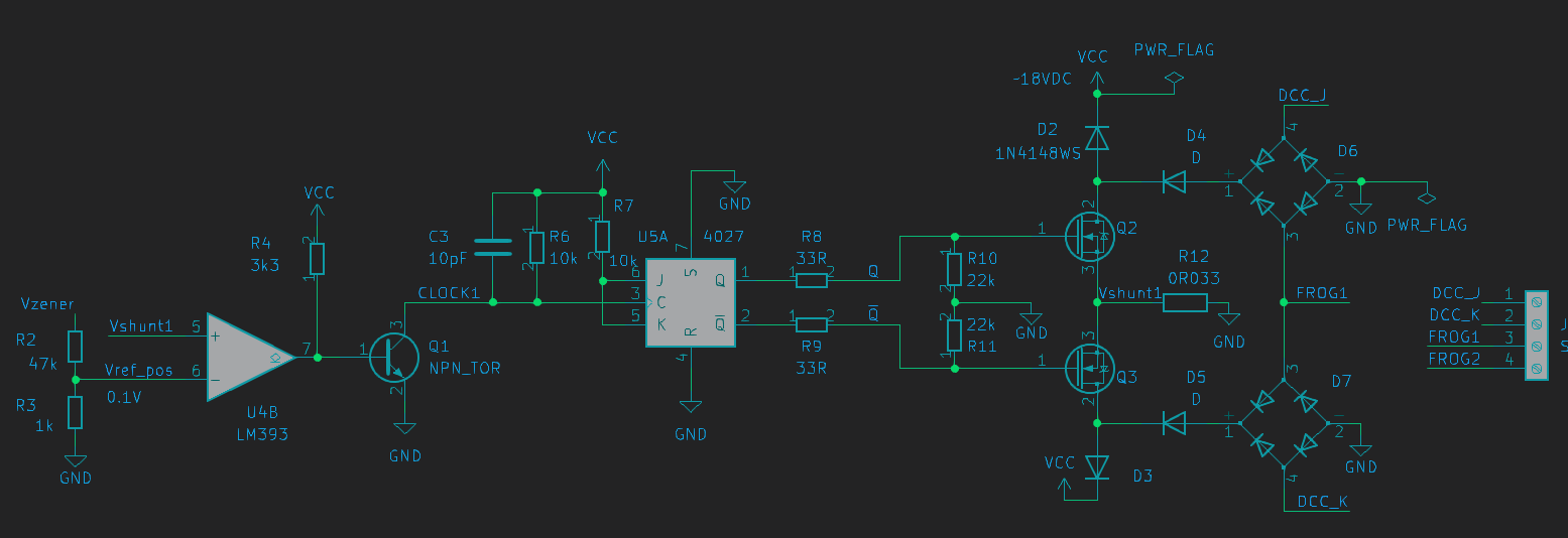 De stroom loopt van DCC -> gelijkrichter -> schottky diode -> Mosfet -> shunt weerstand -> gelijkrichter  -> terug naar frog.