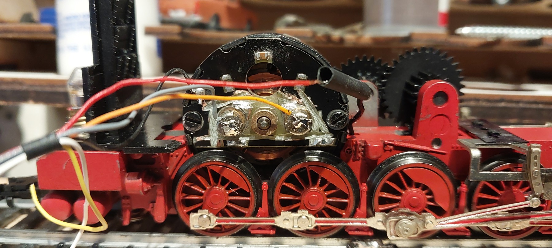 Zwarte draad komt van onderen van de stroomafname dus hier gaat rood op. Zwart gaat op het linkse tinbolletje, oranje rechtermotoraansluiting en grijs op de linker. Sprog3 aangeslingerd en................ niks, foutmelding. ven de multimeter gepakt en wat blijkt, er is massa tussen motoraansluiting en op de messing as uitgang. Dus niet geïsoleerd motorschild. Proxxon erbij gepakt en daar rondom alles weg gefreesd. Bedrading opnieuw gesoldeerd en hoera, Sprog3 leest de decoder nu wel uit. Nummer geprogrammeerd(94) en even voor-en achteruit gereden. Prima, deze doet het dus!!!!! straks maar even de rest aansluiten en weer opbouwen.