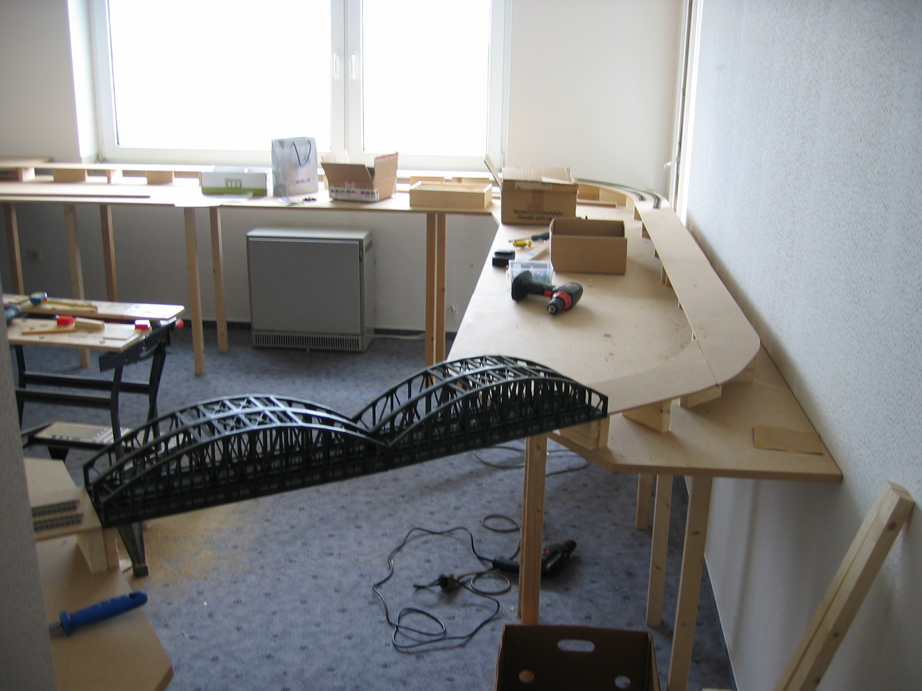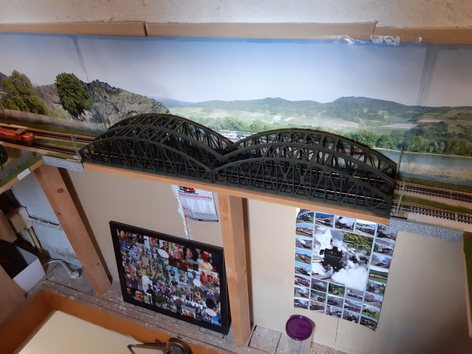 Het wordt een "baan rondom", met ruimte voor een middenpoot. Ik ga dus weer in het midden van de baan staan, net als bij mijn vorige modelbaan en die daarvoor. Telkens gebruikmakend van Roco-bruggen, die ik ook nu weer ga gebruiken om er onderdoor te gaan, zoals hier: