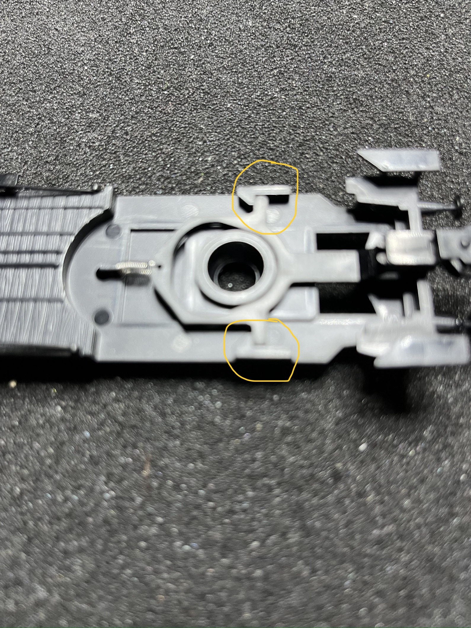 Oplossing is om aan onderzijde van de geel omcirkelde uitsteeksels een dun plaatje te lijmen, zo dun dat het de wielen niet in de weg zit.