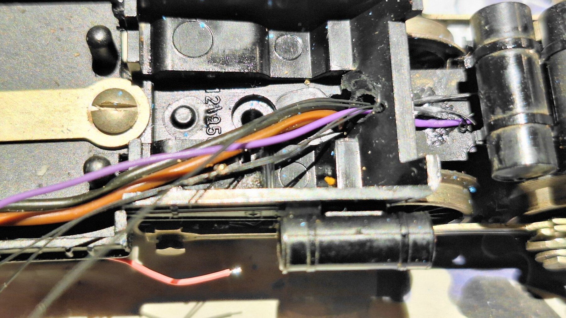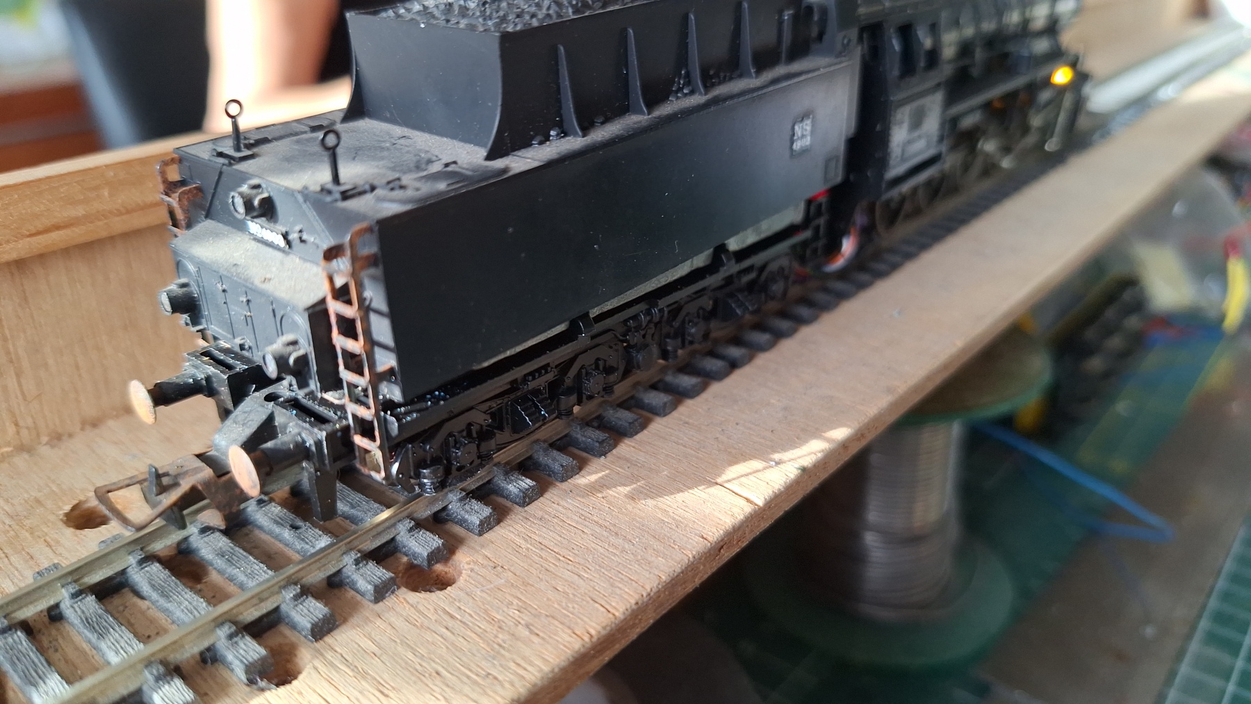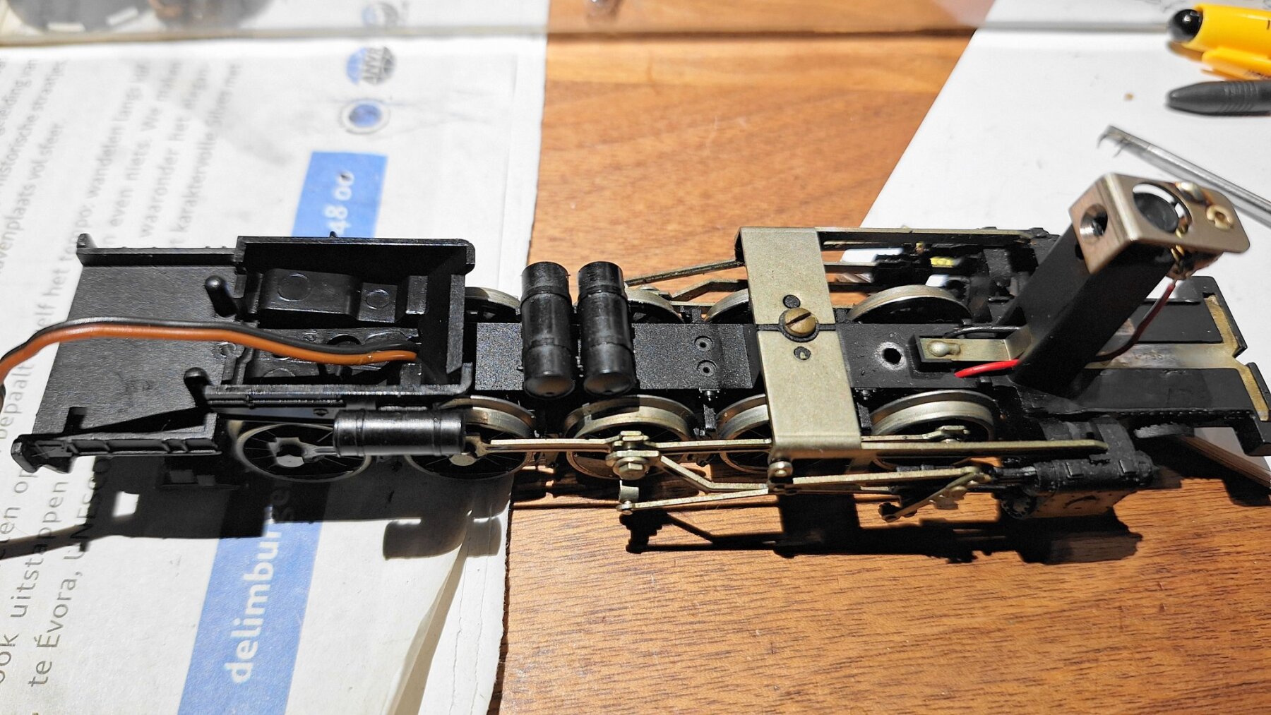 Dus alles weer los. Decoder in de ketel en alle bedrading onder het machinistenhuis naar de tender. Motor, sluitlicht, rijlicht en rangeerlicht.