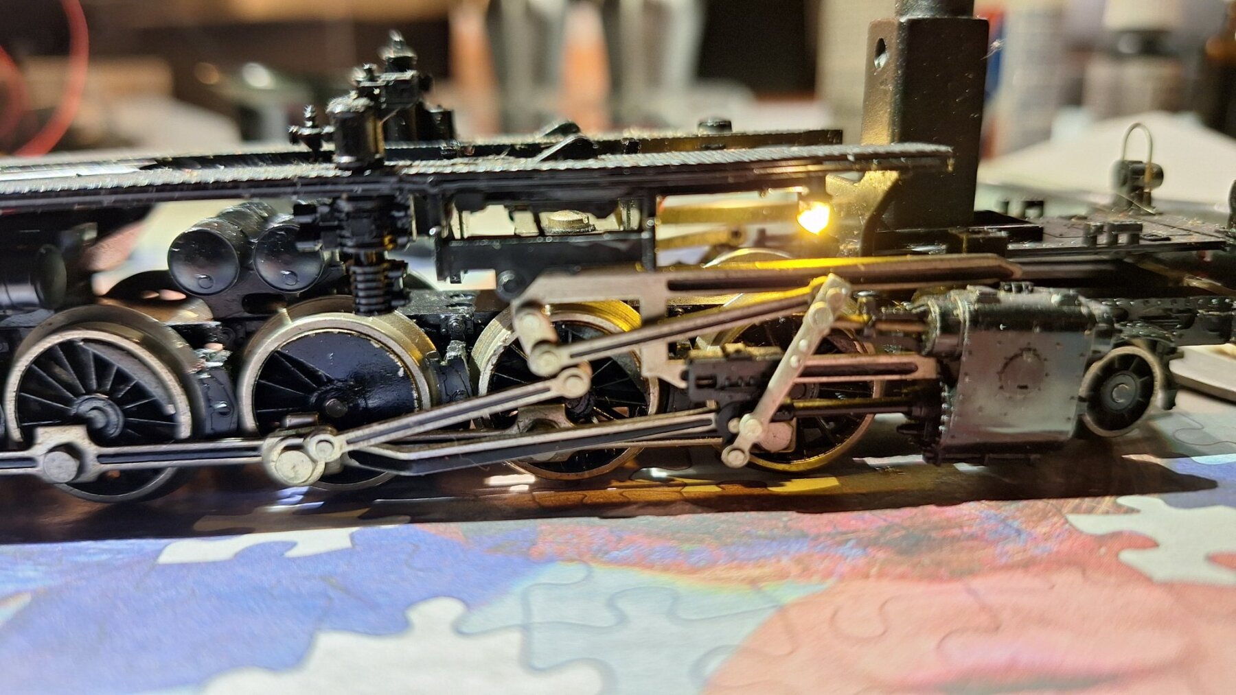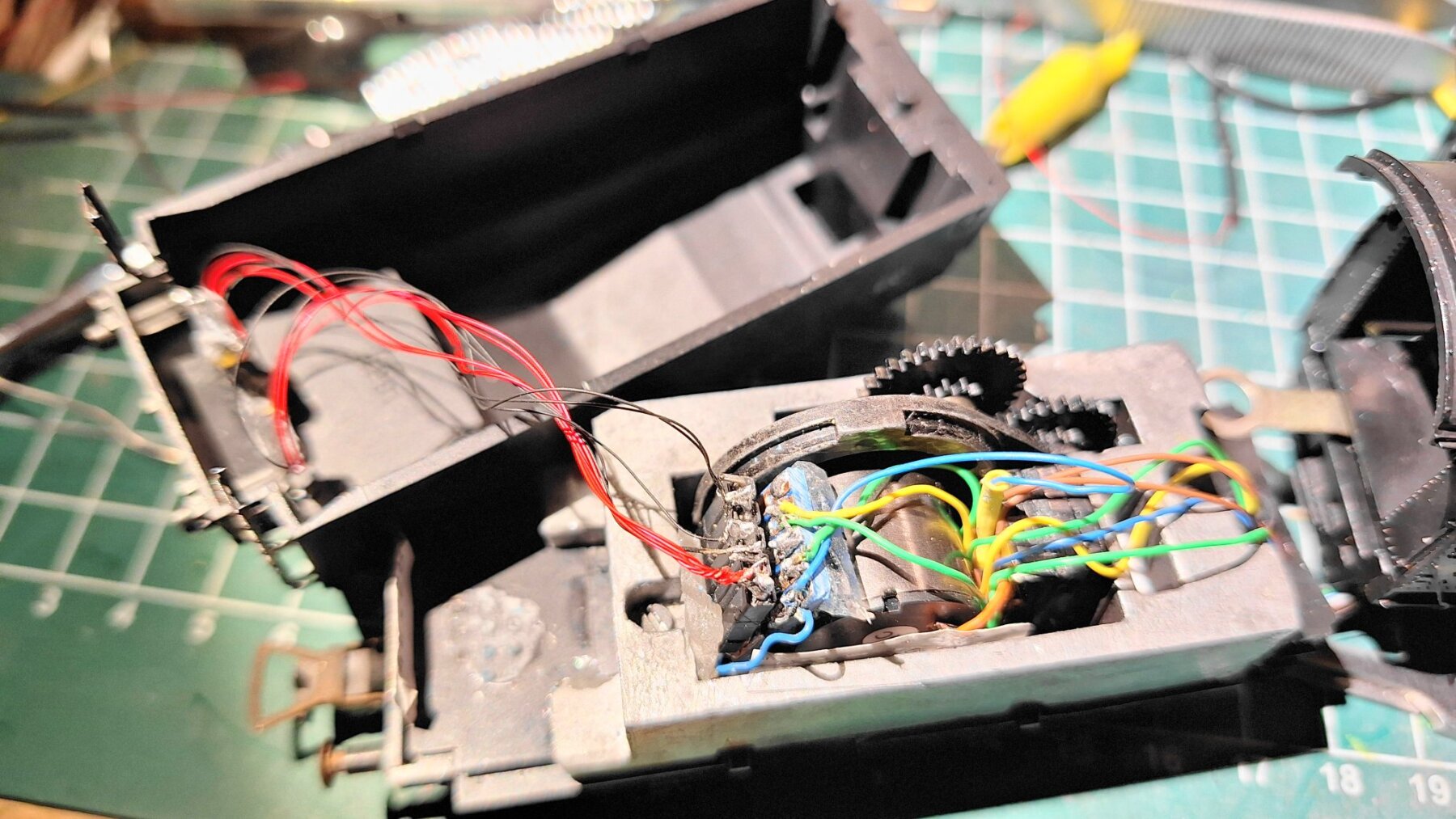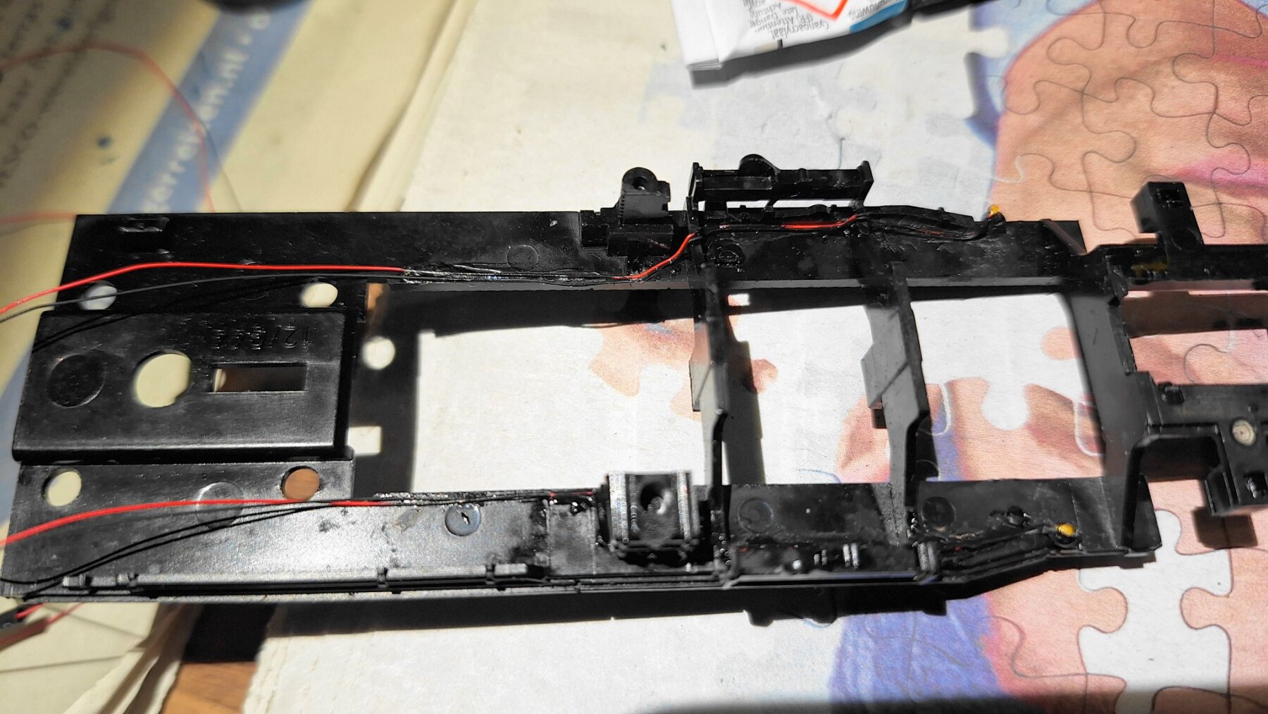 Dus alles weer los. Decoder in de ketel en alle bedrading onder het machinistenhuis naar de tender. Motor, sluitlicht, rijlicht en rangeerlicht.