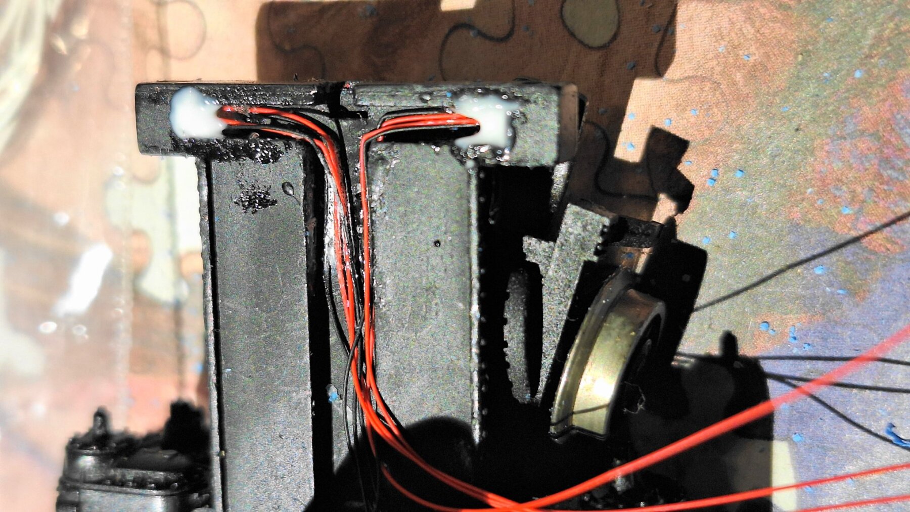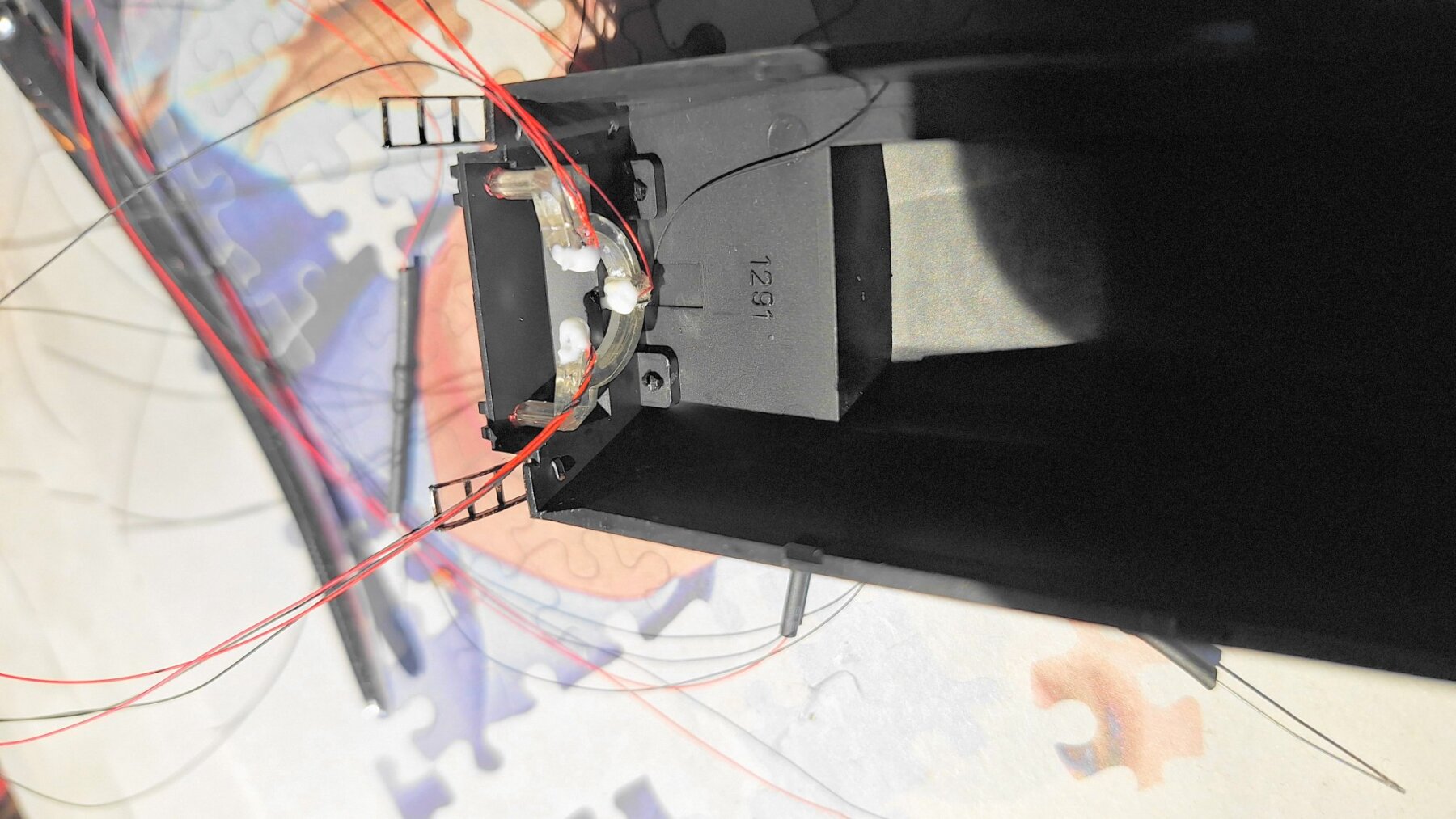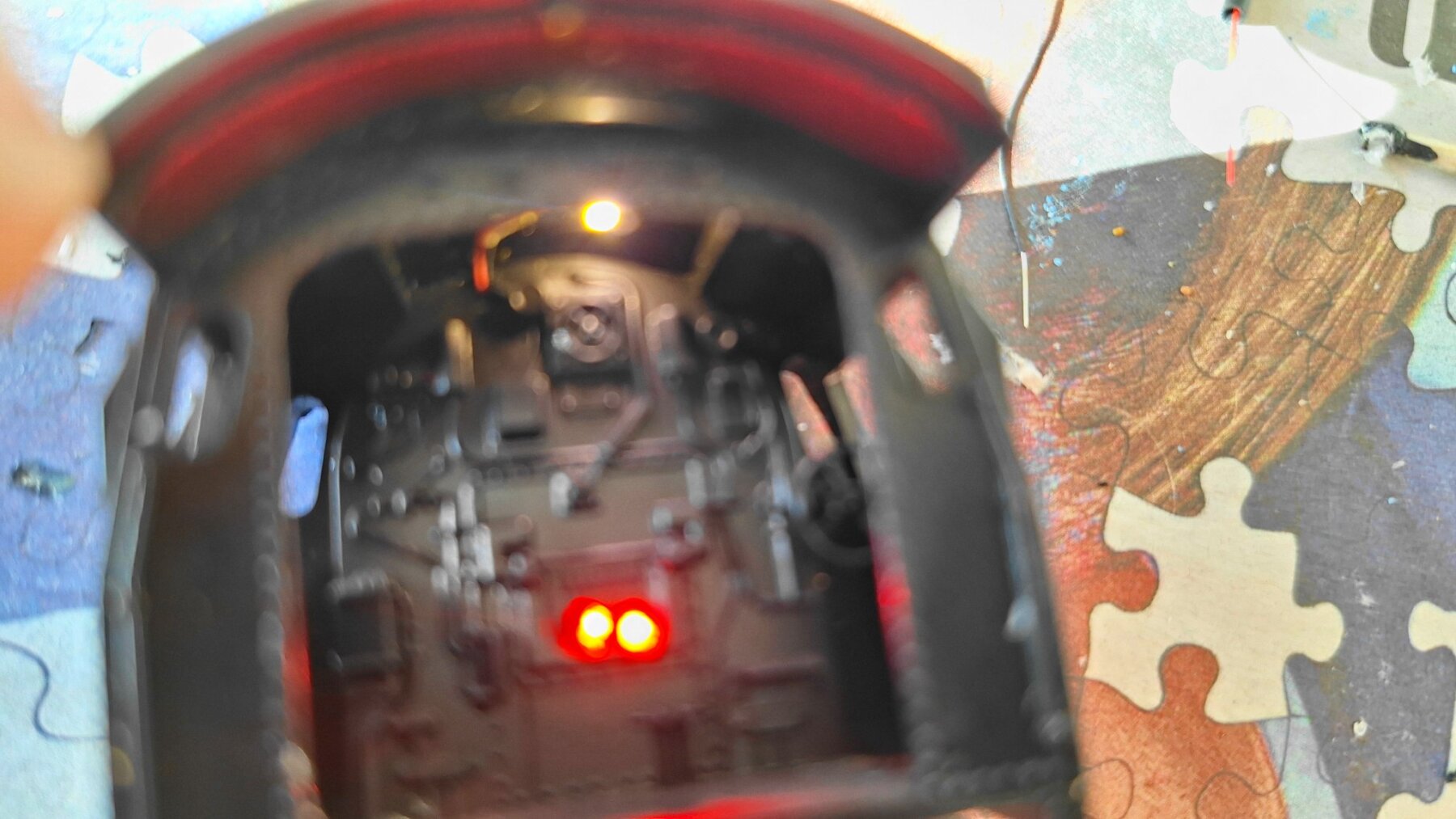 Dan de achterlichten in de tender Dan de decoder in de tender Ook hier wordt voor beide achter lichten een rode en een warmwitte gele led op de licht geleider gelijmd. De midden pit krijgt ook een eigen warm witte gele led.