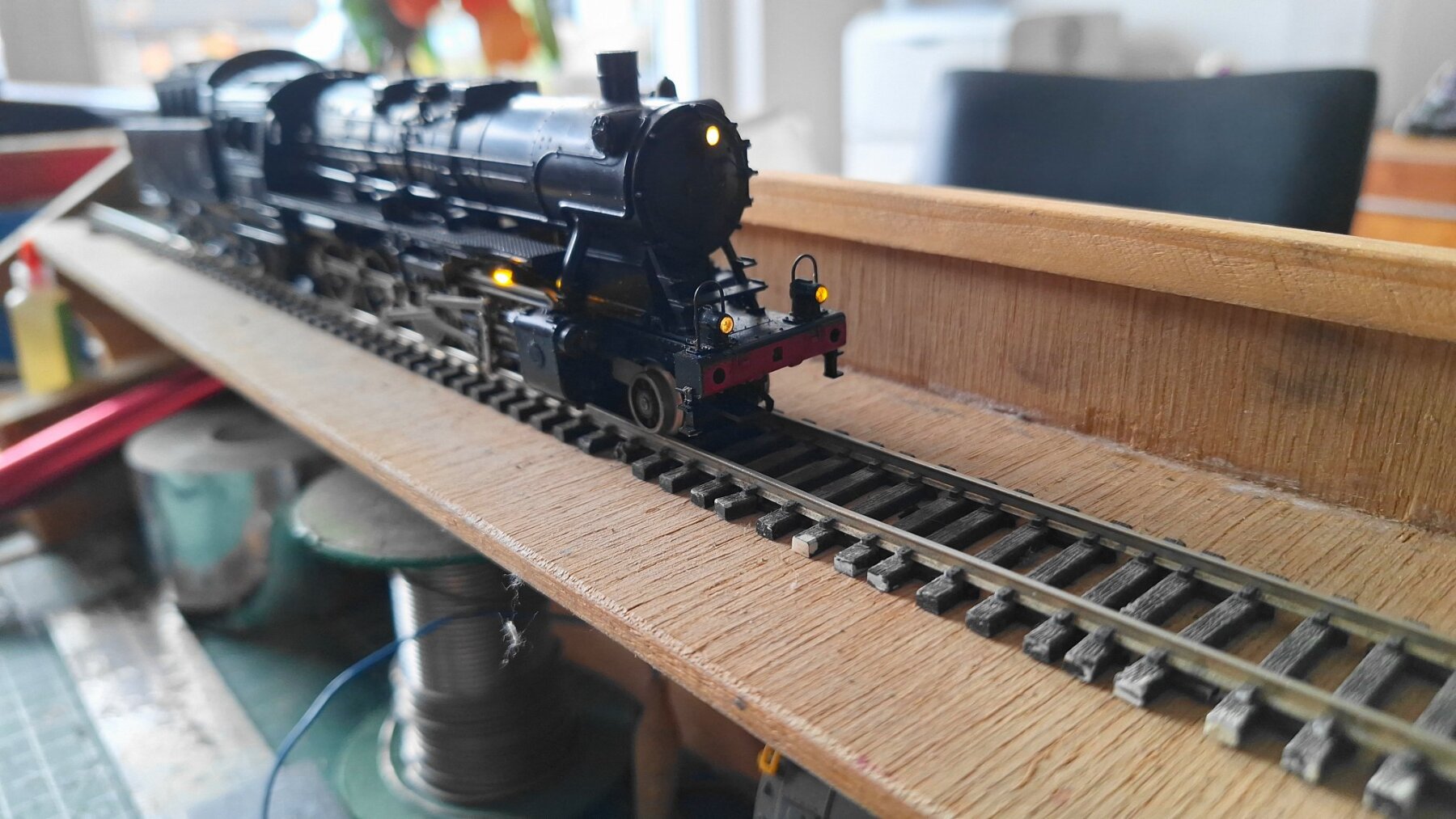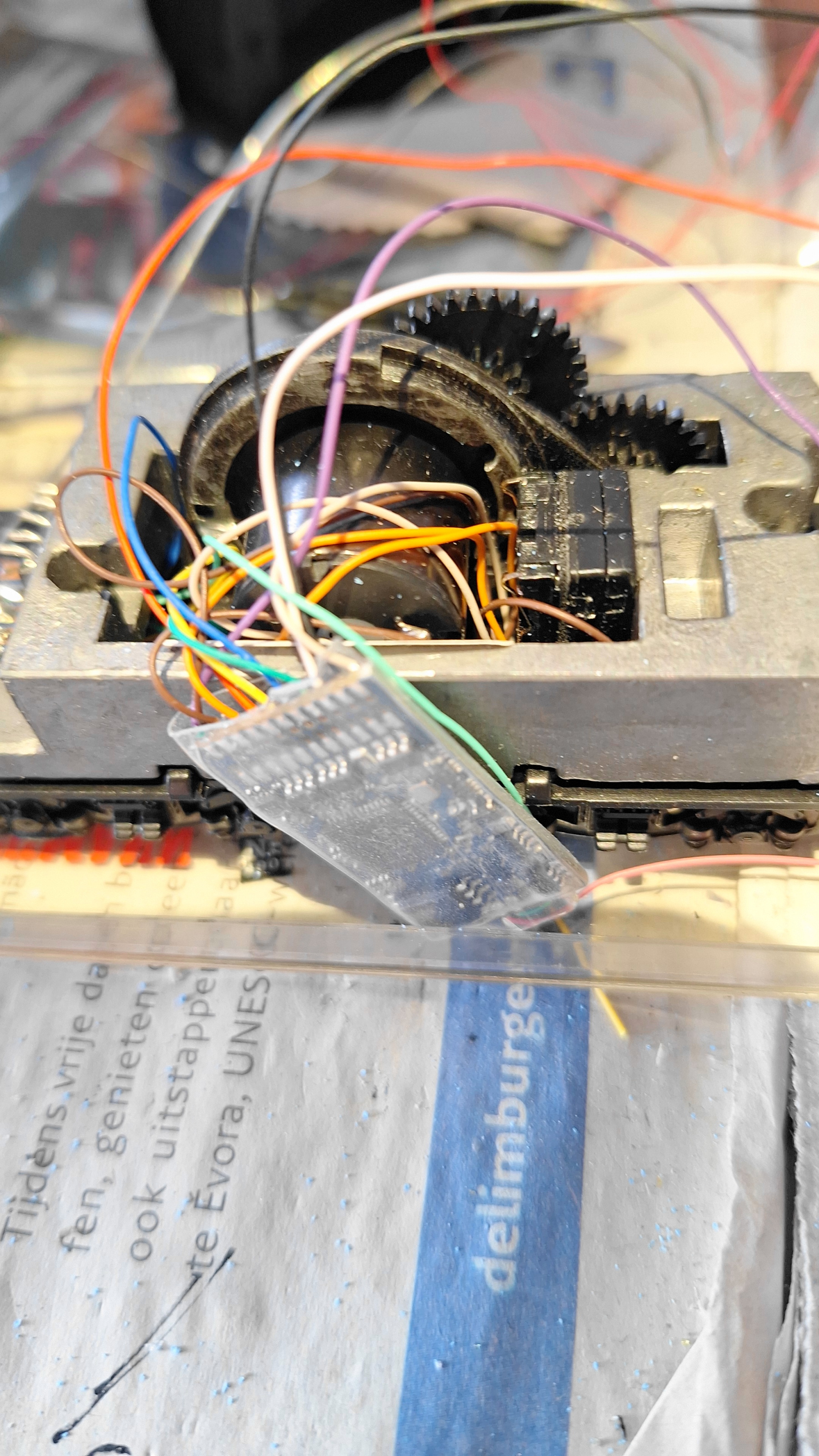 Dan de decoder in de tender en alle bedrading lekker gesoldeerd. Toch nog ff teste voor ik ze frontleds aan de decoder vast soldeer. Poef aan en voor altijd uit.....ik had de grote weerstanden er al afgeknipt en de 9v batterij zonder de nieuwe op stukjes print gesoldeerde smd 1K weerstandjes er tussen geprobeerd