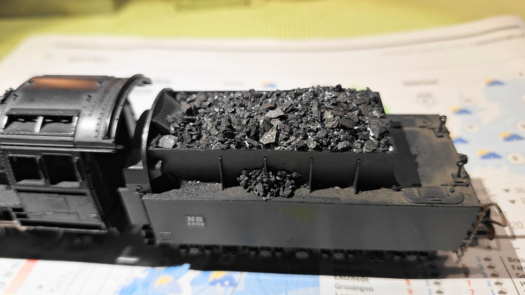 Dan nog echte kolen fijn gemaakt en op de tender gelijmd met wat houtlijm.