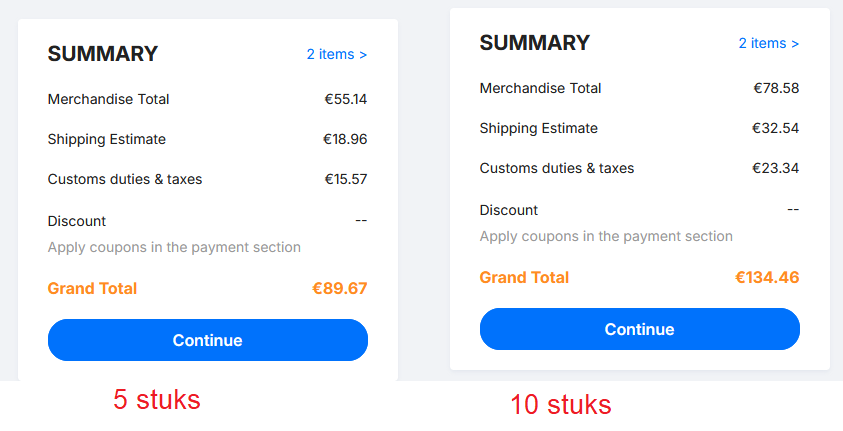 Ter vergelijking. Ik heb net een offerte uitgevoerd bij JLCPCB voor 5 stuks en 10 stuks. Die 5 minuutjes...