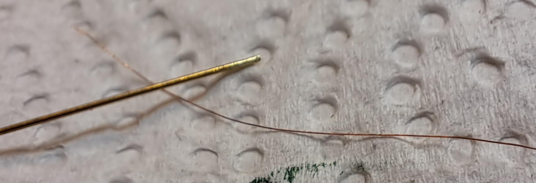 Één ader wikkel je om het messingdraad. Het gewikkelde draad schuif je naar het uiteinde.