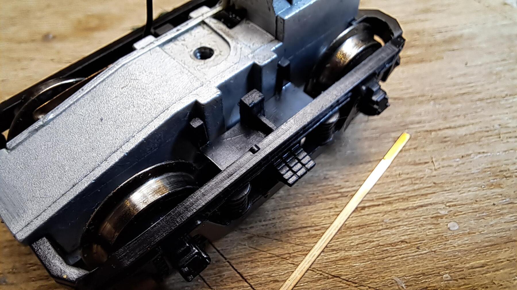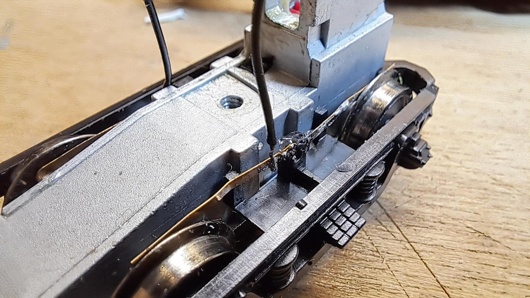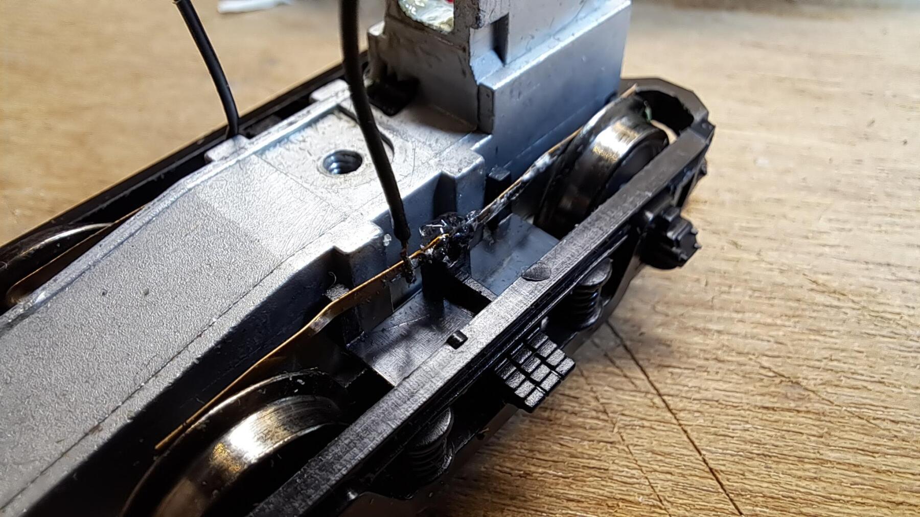 Na een paar honderd meter (als al) begaven de cardanhouders van de Blokkendoos het. Nieuwe besteld bij Roco en ingezet. Ook een stroomafnemer was defect. Uit een stripje een nieuwe gemaakt en omdat de originele een gat heeft wat om een palletje valt en dat stripje daarvoor te smal is, deze ingesmolten en verlijmd. Decoder er in en hopla, de baan op!