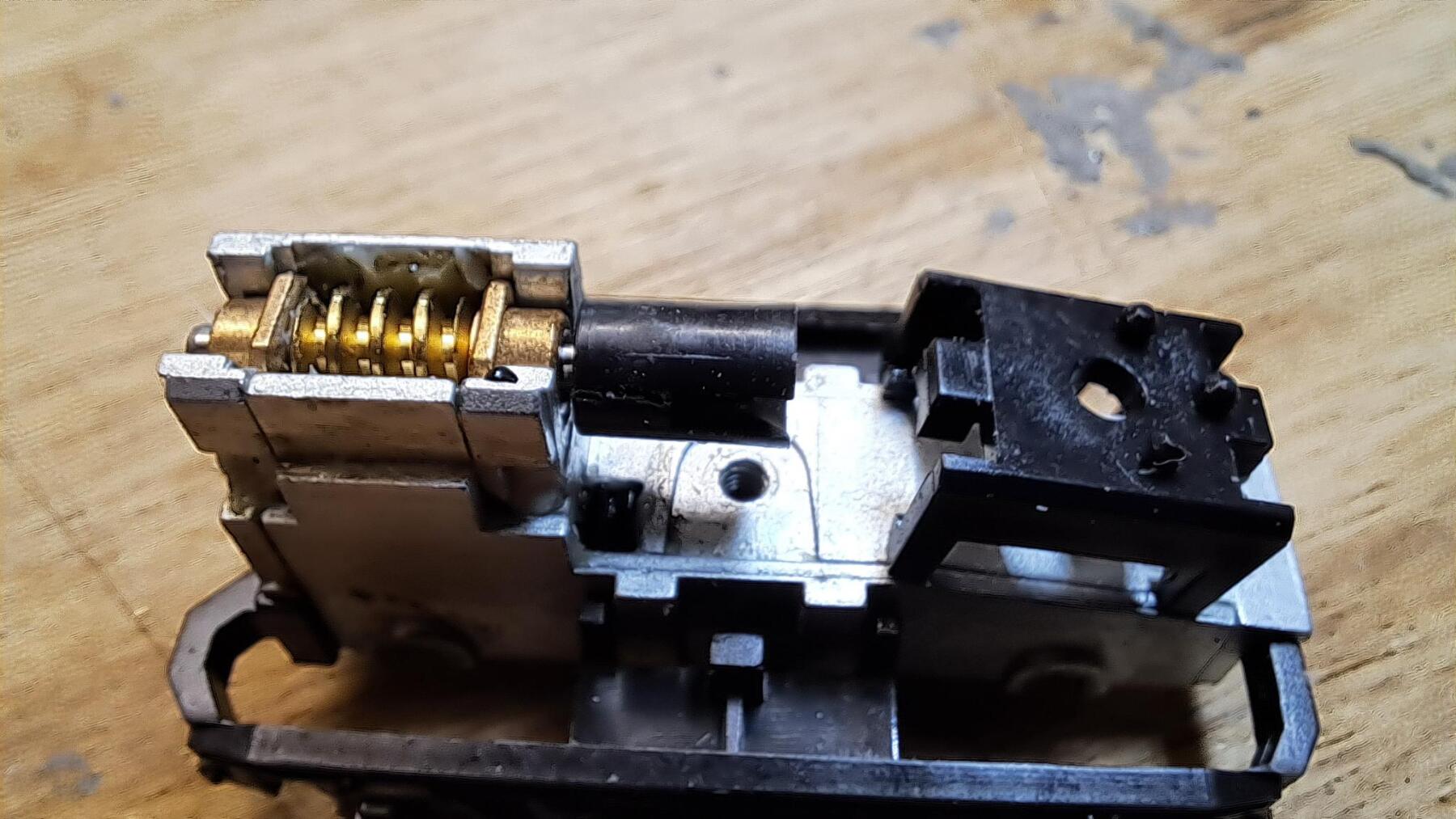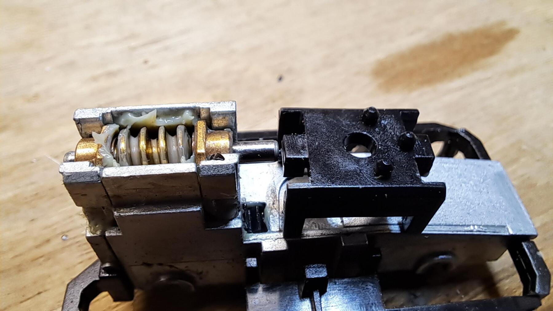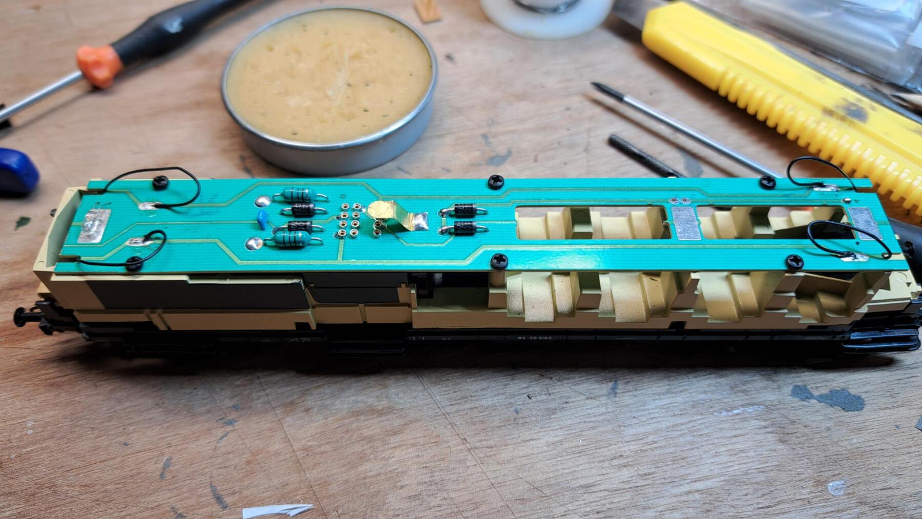 Na een paar honderd meter (als al) begaven de cardanhouders van de Blokkendoos het. Nieuwe besteld bij Roco en ingezet. Ook een stroomafnemer was defect. Uit een stripje een nieuwe gemaakt en omdat de originele een gat heeft wat om een palletje valt en dat stripje daarvoor te smal is, deze ingesmolten en verlijmd. Decoder er in en hopla, de baan op!