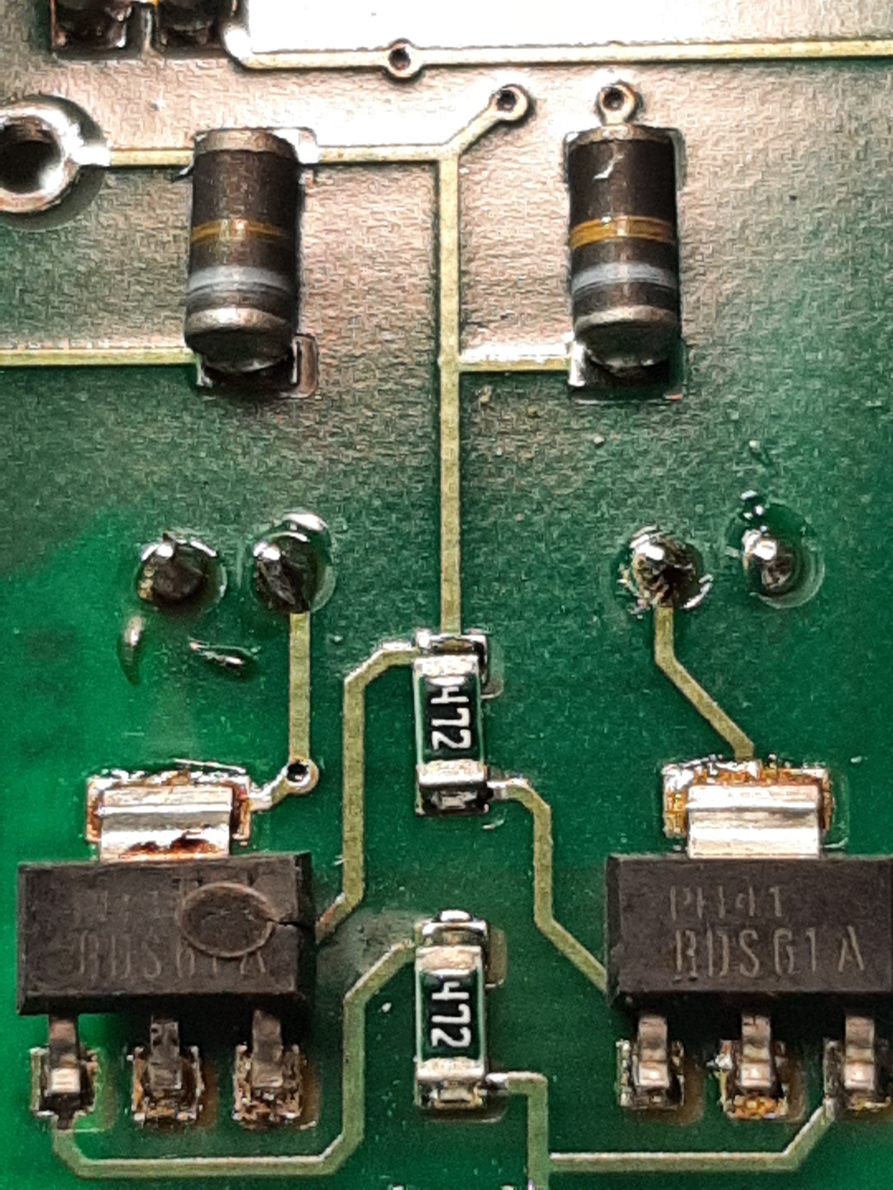 de toevoer van spanning naar de motor loopt via een component die gebarsten is: zie de foto, erop staat iets van