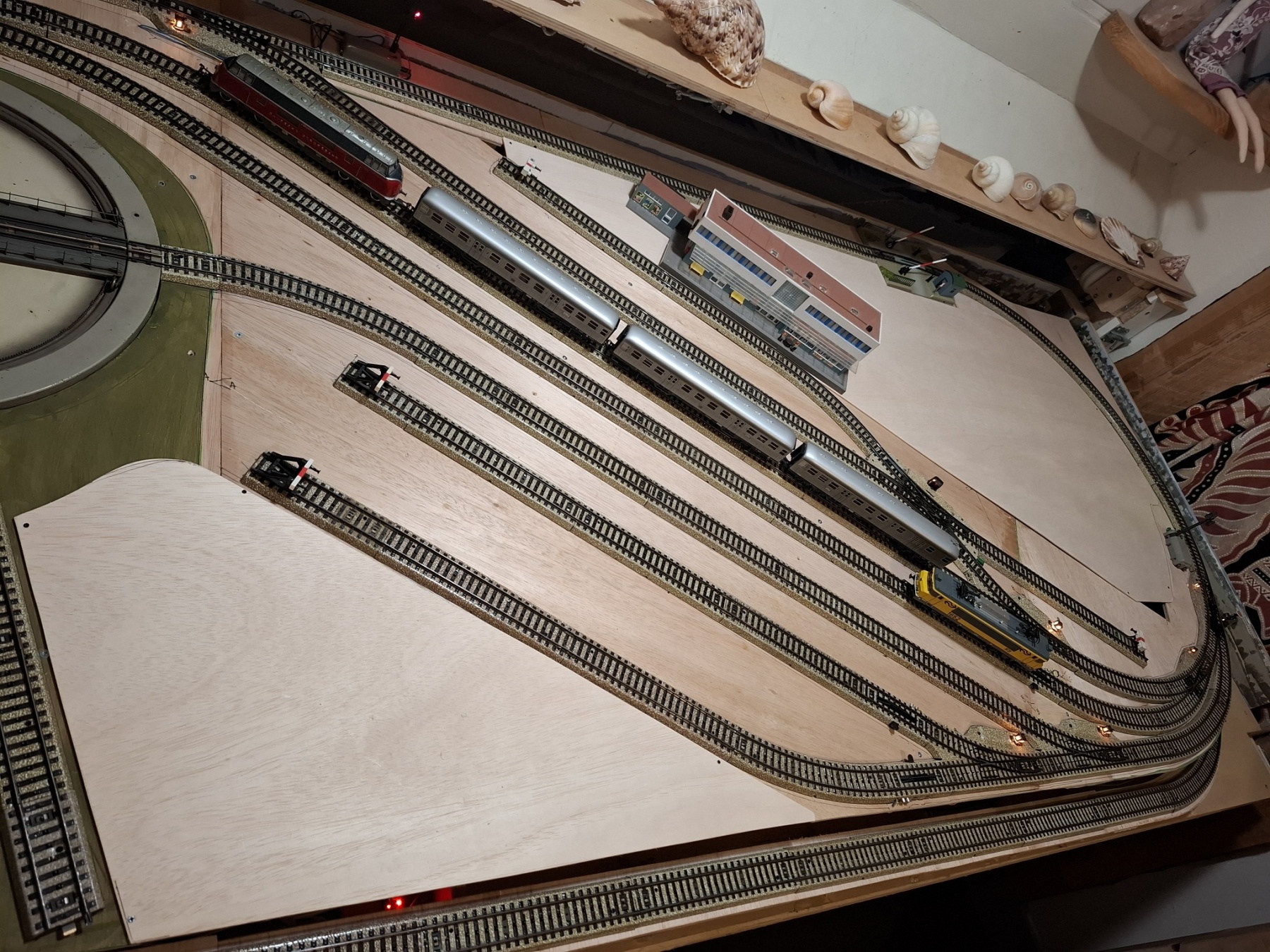 Het schaduwstation heb ik eerst in anyrail opgetekend en daarna op de plaat uitgelegd. "Live" is het toch weer heel anders en blijken een paar aanpassingen een veel langere nuttige lengte van de sporen op te leveren. Het middelste spoor kan 3 rijtuigen en een lok herbergen, de 2 buitenste 4 en een lok. De keerlus wordt maar in 1 richting bereden, namelijk eerst rechtdoor via het lange enkele spoor (wat ook een schakelbaar spoor is) en daarna via een ondergrondse wisselstraat naar de 3 opstelsporen. Het kopspoor is het enige geschakelde wissel achterin. Boven de wisselstraat aan de voorzijde zit een luik zodat ik er goed bij kan als er wat mis gaat.
