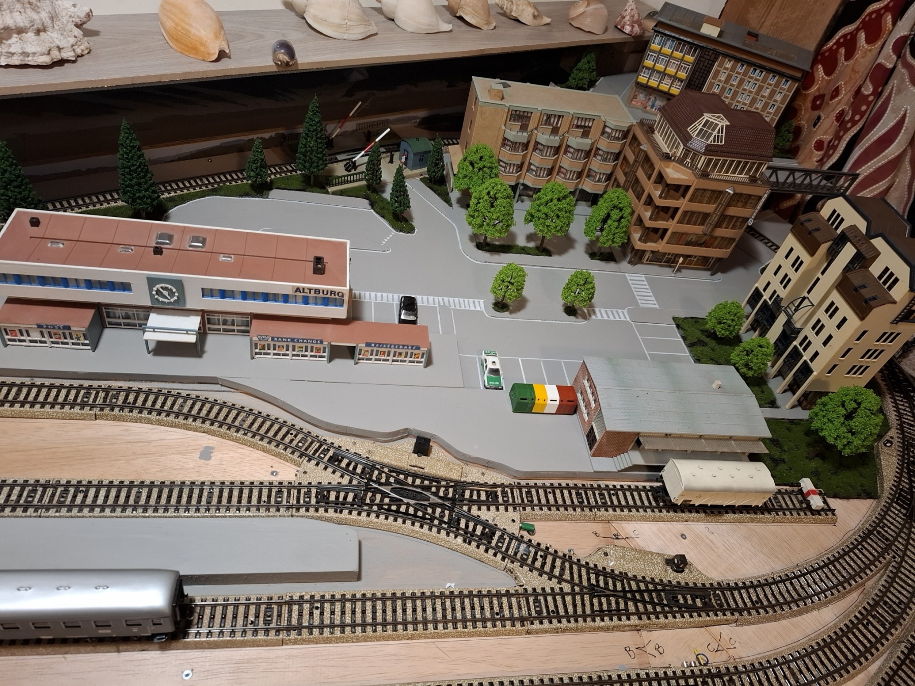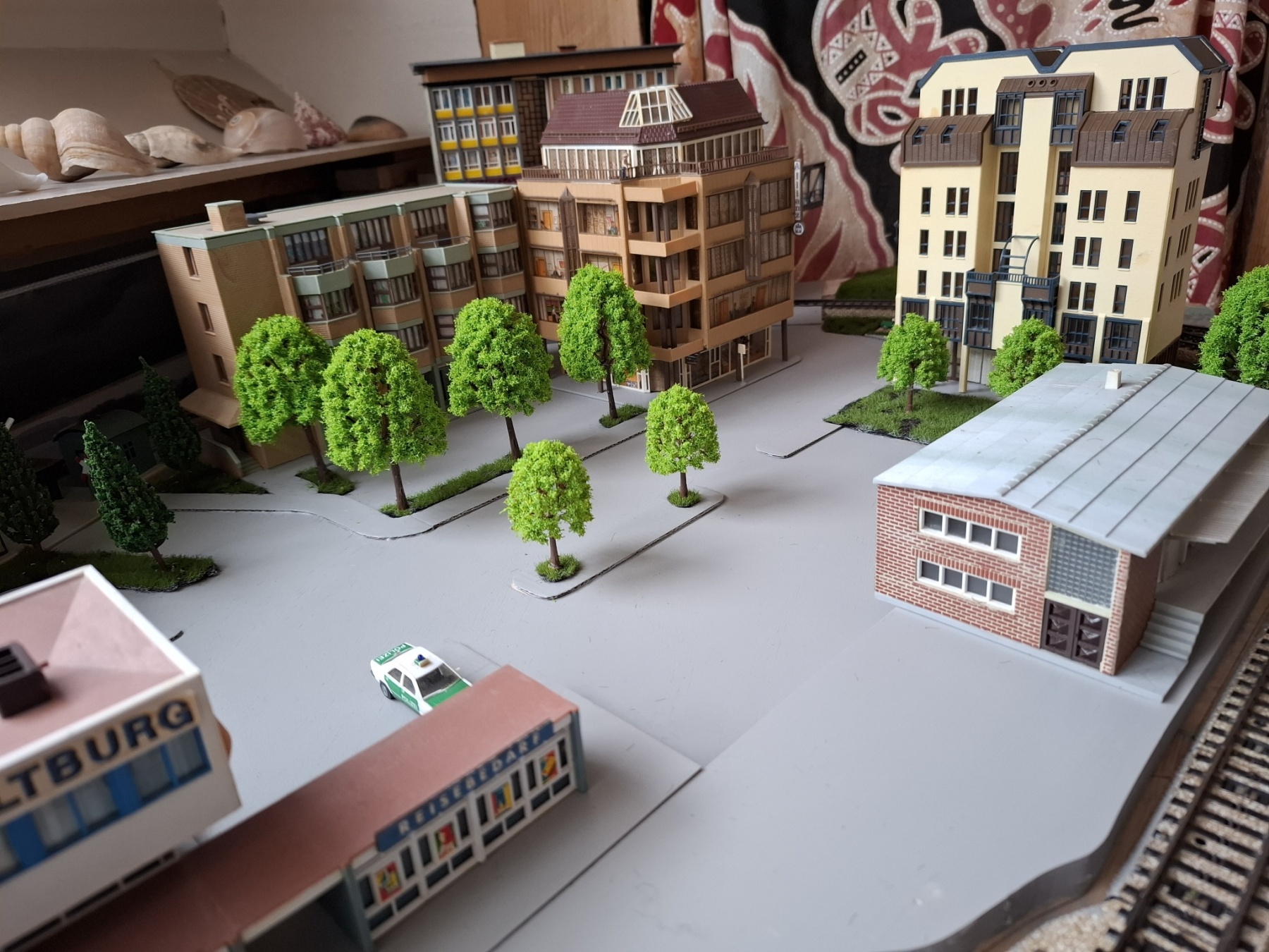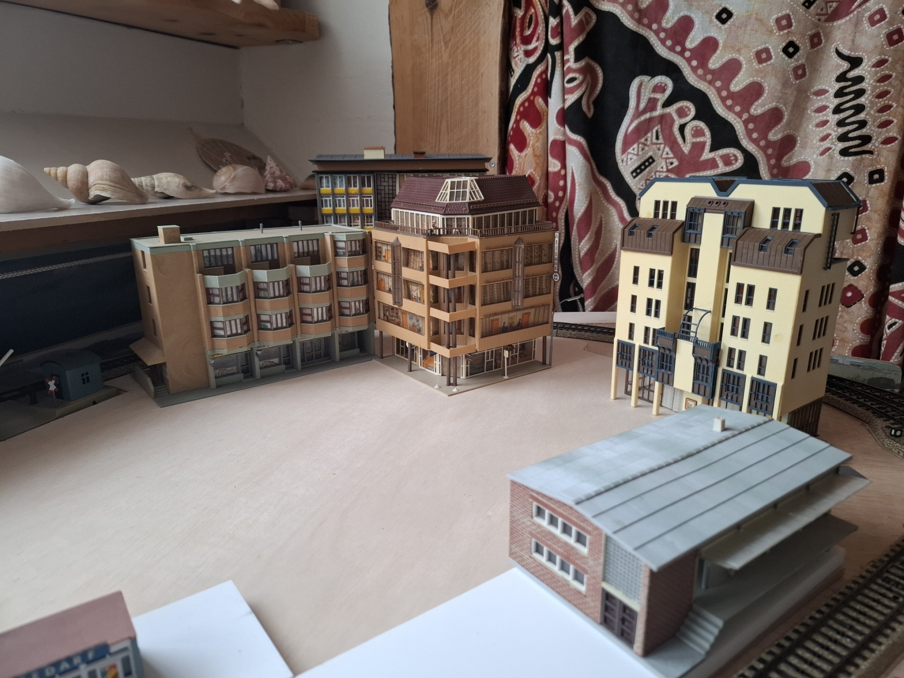 De plaatjes geven een beetje een idee van hoe de stad eruitziet. In de loop van het topic zullen er zeker nog meer foto's volgen, maar de baan wilde ik eerst globaal helemaal klaar hebben (dan kan hij in geval van nodig opgeklapt worden) en daarna pas overgaan naar detailleren. Ik vind het sfeertje best leuk, als ik op google maps (was mijn inspiratie) door modernere steden heen navigeer is de sfeer vergelijkbaar. En dat maakt dat een TEE of andere internationale trein die hier stopt best wel logisch eruit ziet, ondanks dat het maar een kleine modelbaan is.