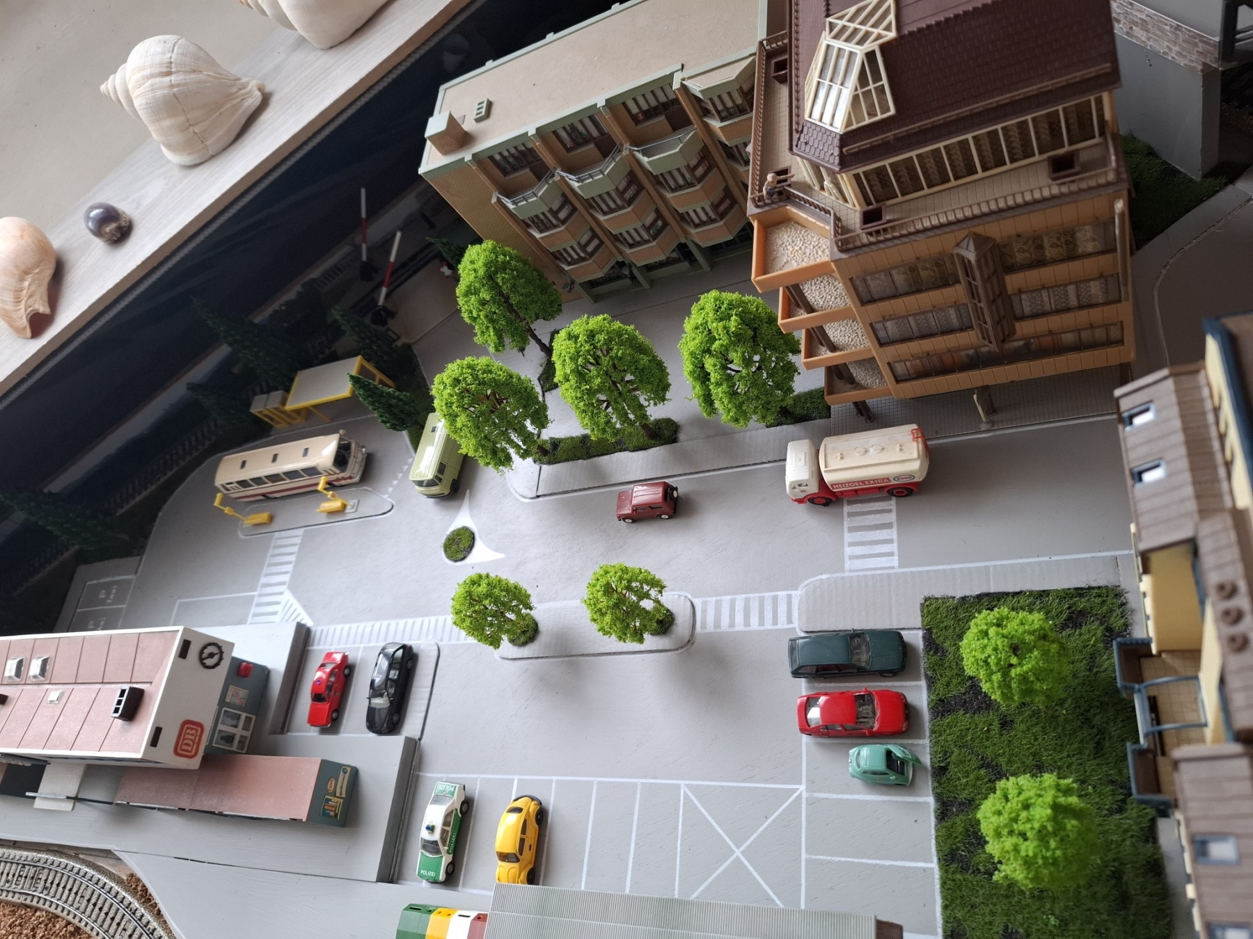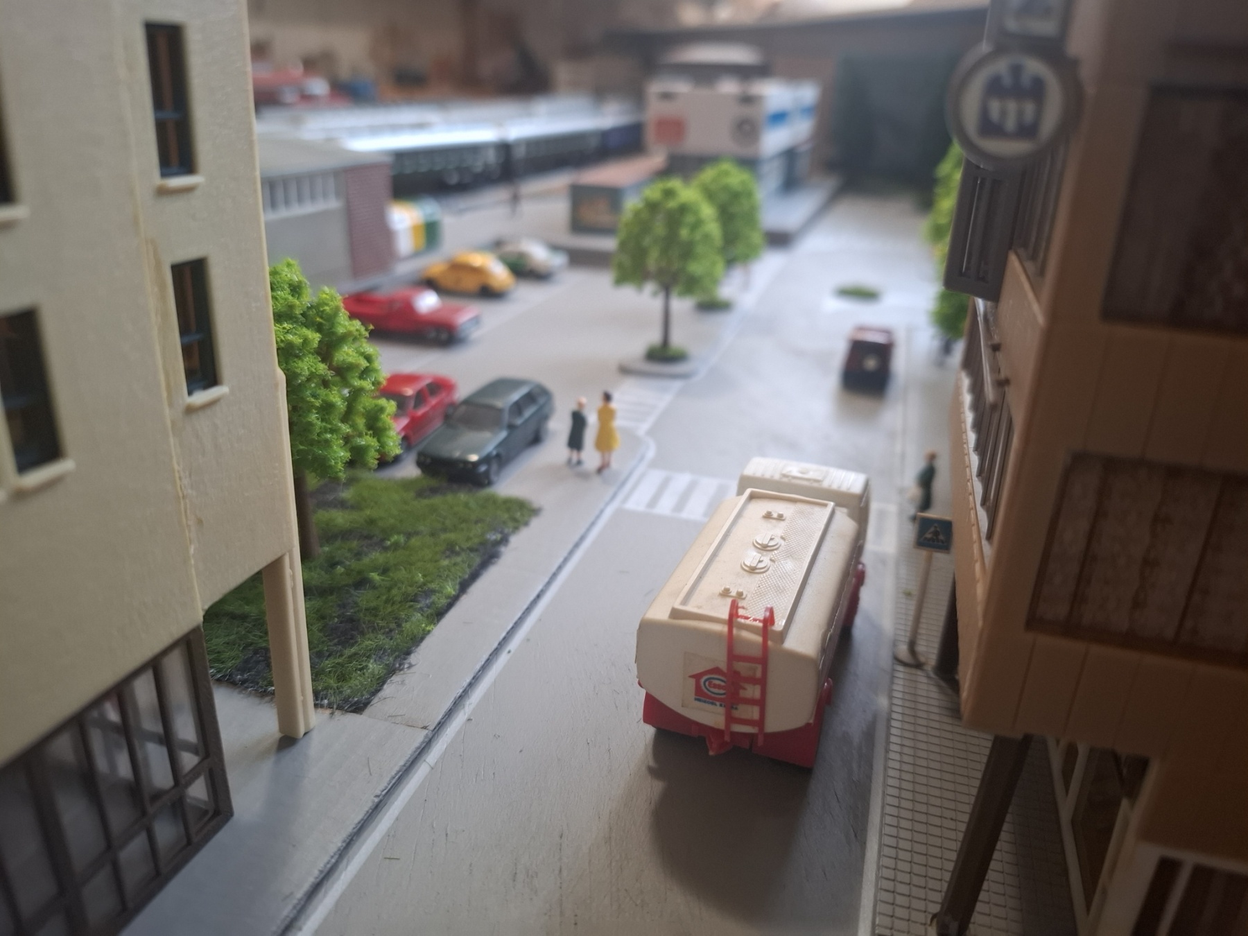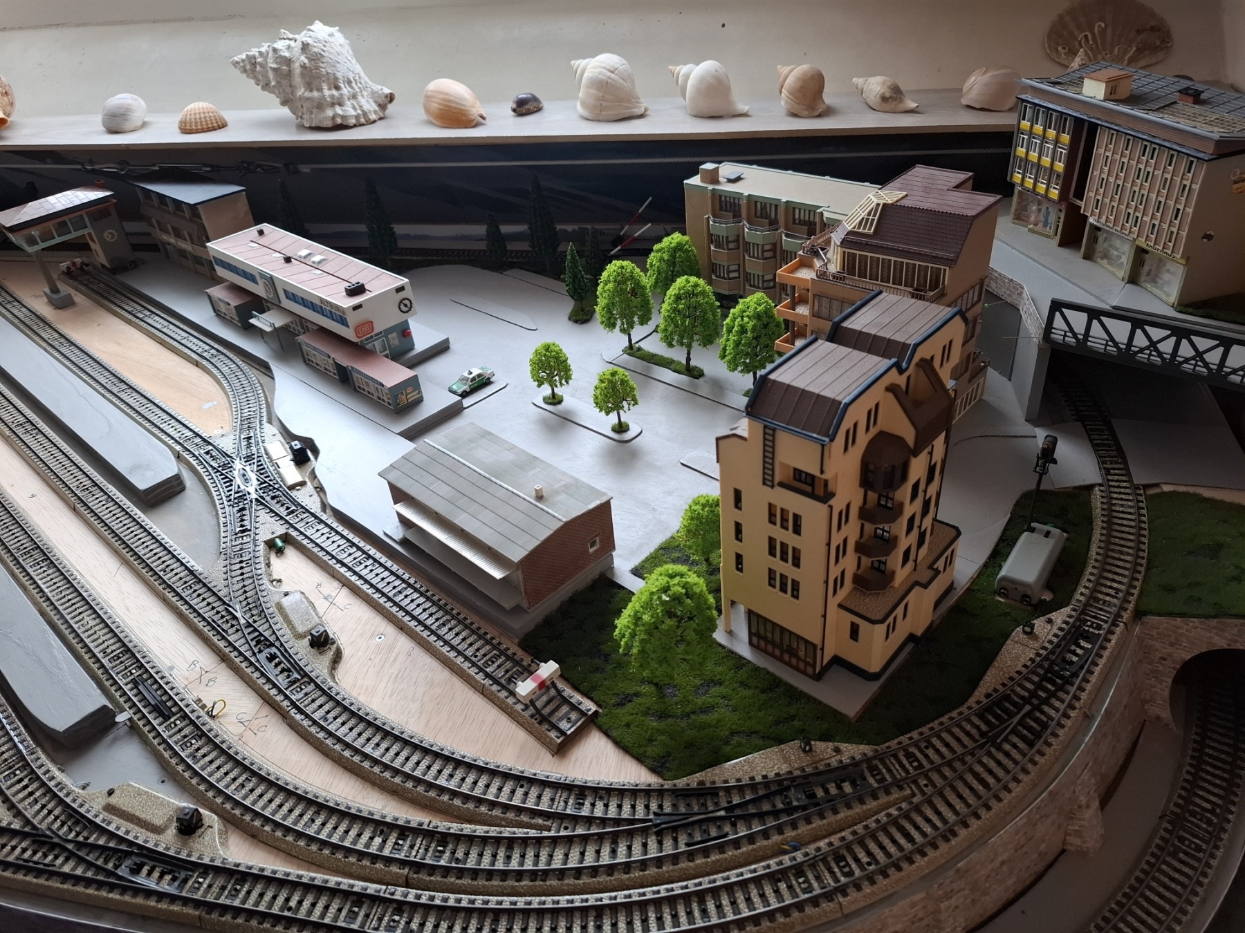De plaatjes geven een beetje een idee van hoe de stad eruitziet. In de loop van het topic zullen er zeker nog meer foto's volgen, maar de baan wilde ik eerst globaal helemaal klaar hebben (dan kan hij in geval van nodig opgeklapt worden) en daarna pas overgaan naar detailleren. Ik vind het sfeertje best leuk, als ik op google maps (was mijn inspiratie) door modernere steden heen navigeer is de sfeer vergelijkbaar. En dat maakt dat een TEE of andere internationale trein die hier stopt best wel logisch eruit ziet, ondanks dat het maar een kleine modelbaan is.