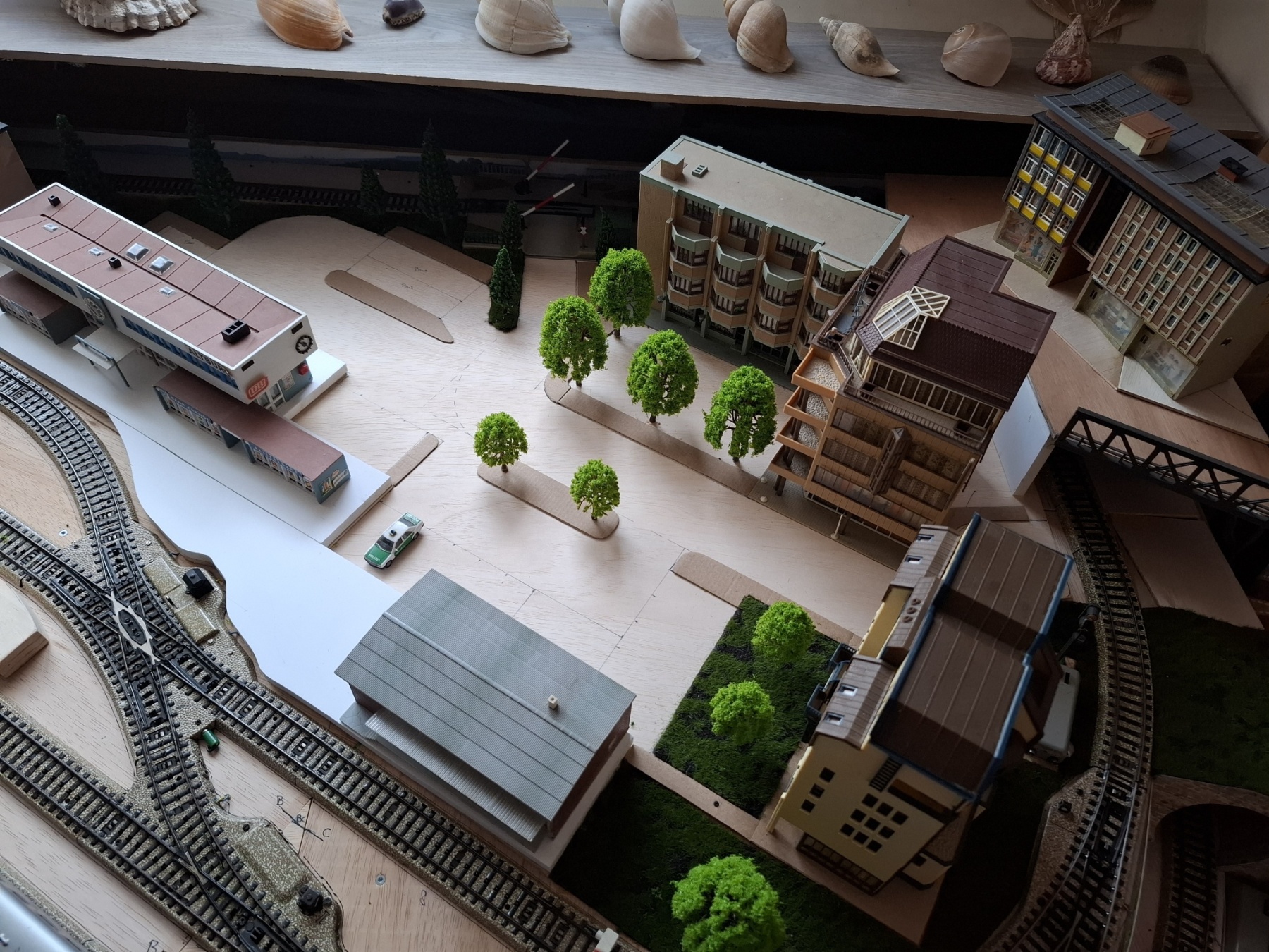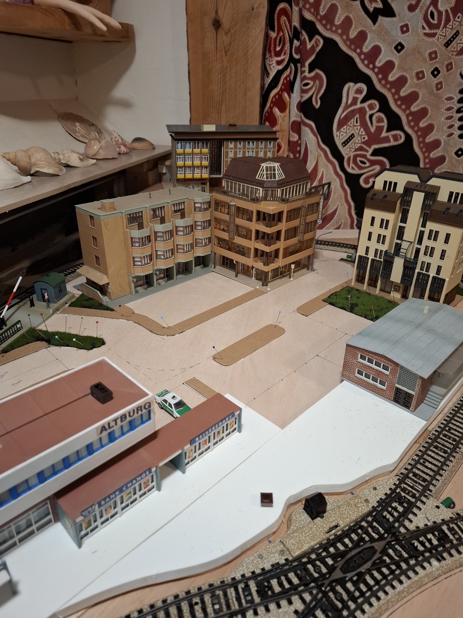 De 2e hands huisjes die ik heb uitgezocht zijn geplaatst. Ik wil een moderne binnenstad bouwen met een modern station, zodat er niet meteen een dikke stempel op staat en (even afgezien van de naam op de stationsgevel) de stad ook in Nederland of Zwitserland zou kunnen liggen. Doordat ik nu nog een leeg veld heb, kan ik de stad nog veranderen. Ik gebruik hiervoor wat truukjes zoals lage bebouwing vooraan en hoge achteraan, zodat het geheel veel groter lijkt dan dat het is. Ook zijn sommige gebouwen hol van binnen en staan deels over de keerlus heel, zodat de trein "verdwijnt" in de stad. Door een paar grote gebouwen te gebruiken in plaats van een hoop kleintjes, wordt het gevoel van ruimte en een grote stad extra benadrukt.