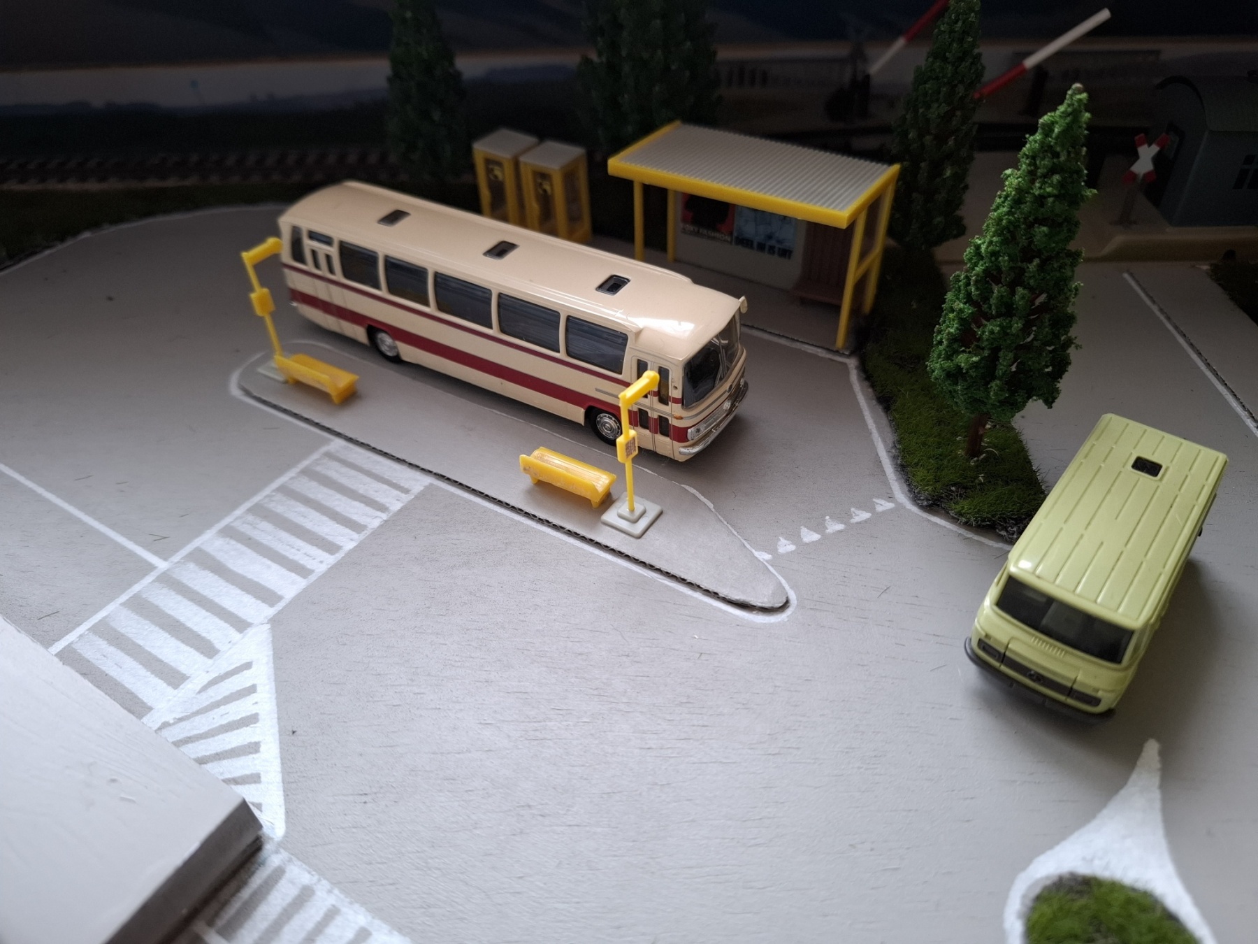 Met grijze betonverf de wegen en stoepen geschilderd, ook van 10mm schuimplaat (reclamemateriaal) perrons gesneden die erg licht zijn en de naad tussen de overgang van het vaste deel en het luik netjes verstoppen. Een klein goederenloodsje geeft een doel aan het extra spoortje. Altijd leuk om te zien wat kleur met een landschap doet. Het veranderd door de grijze verf van een knutselproject naar een kale stad..