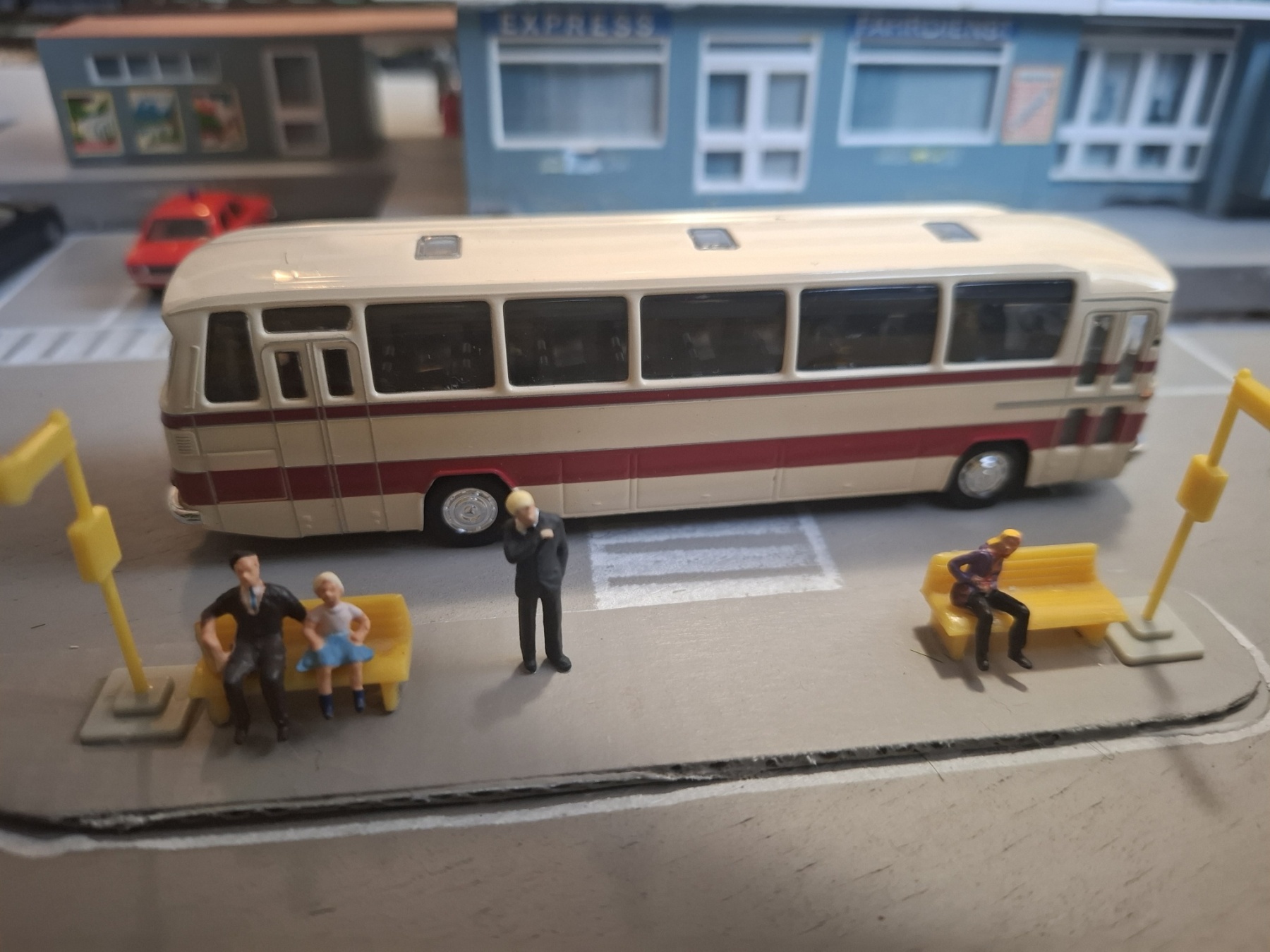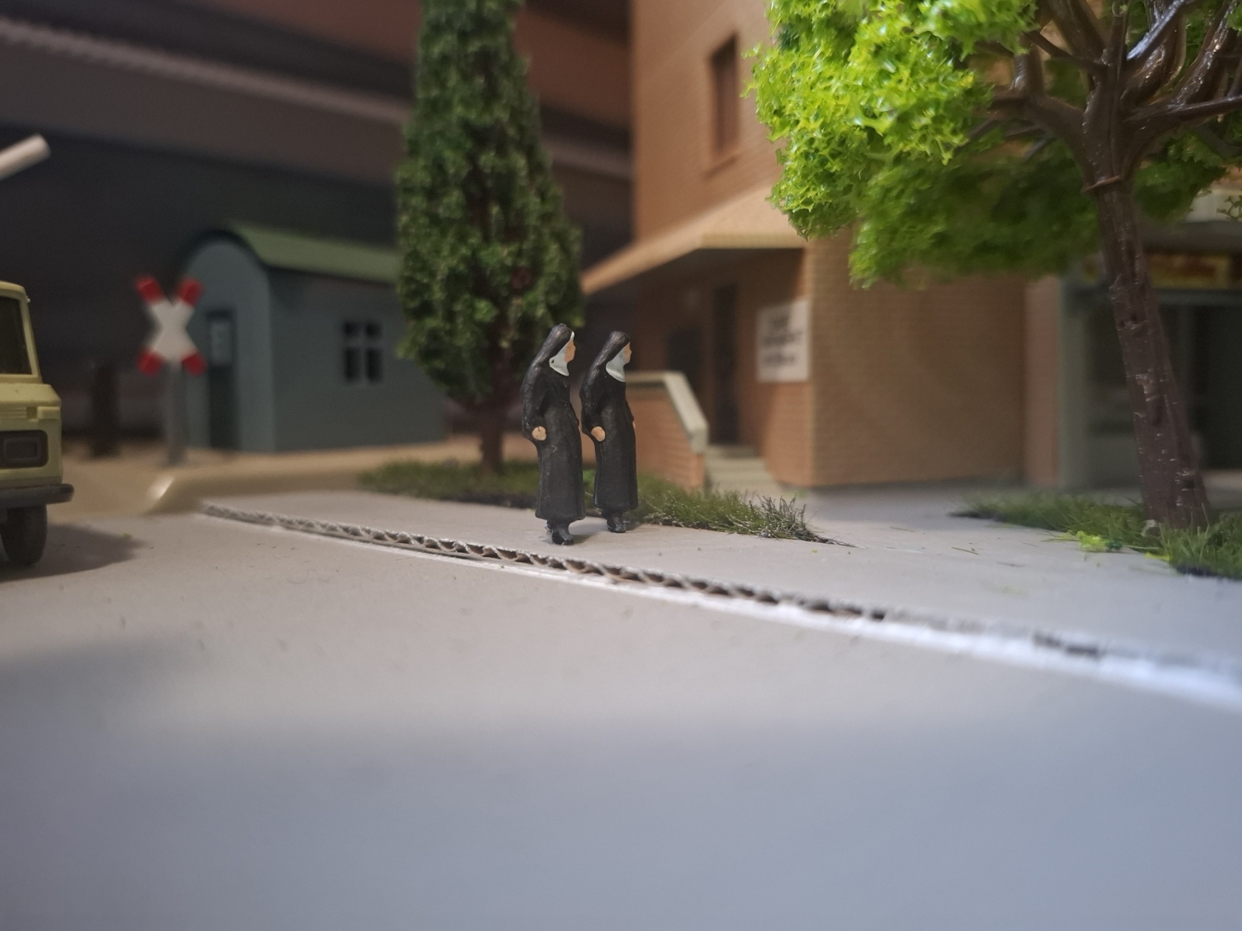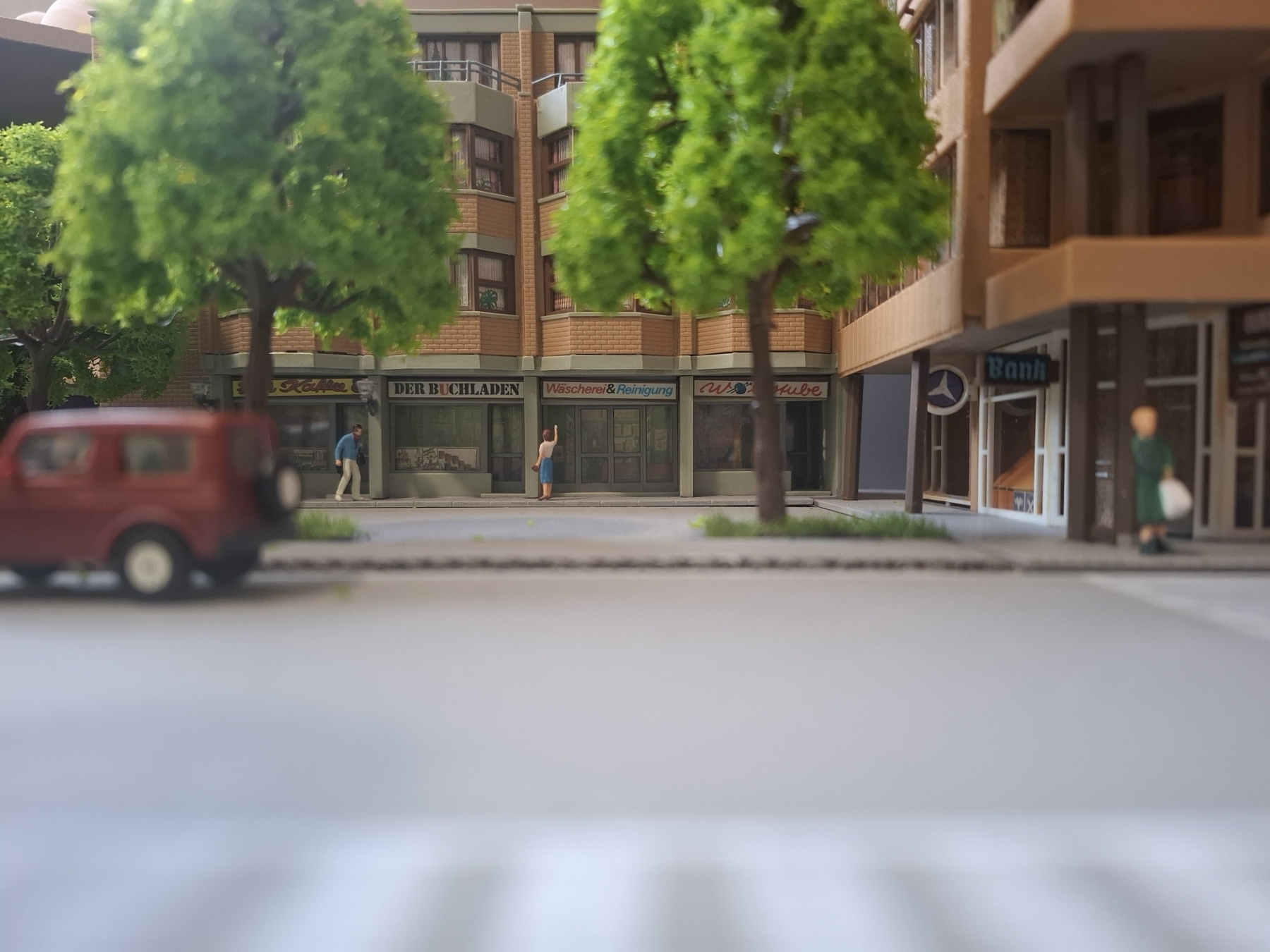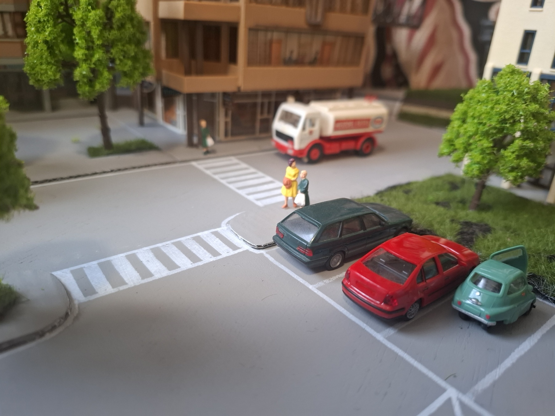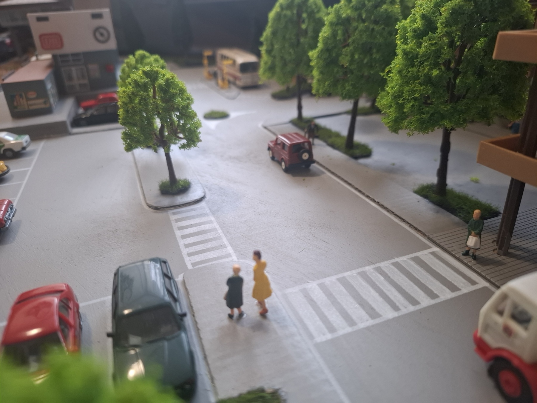 Met witte verfviltstift heb ik wegmarkeringen gemaakt en zebra's, met een detailsetje van Faller nog een paar typische stadsdingen als telefooncellen (was ik al lang vergeten dat die in mijn gemodelleerde "tijd" nog bestonden) is de stad aangekleed. Een berg poppetjes erin en zo langzamerhand begint het al ergens op te lijken. Hieronder een aantal impressies van de stad en de bevolking: