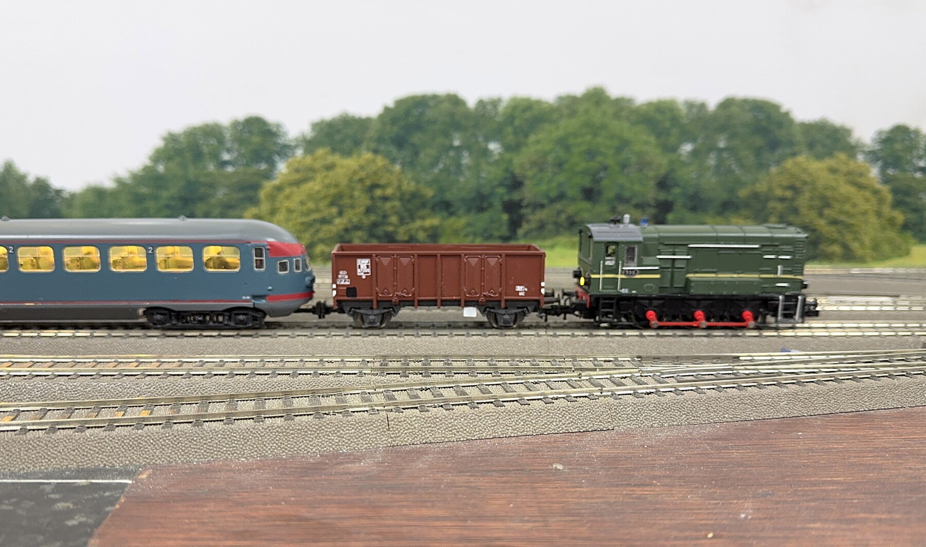 En voilà, een goed zittende beugelkoppeling aan de PEC!! Metalen stripje ietsje omhoog gebogen, zodat ik het rijtuig op goede hoogte keurig aan een Piko koppelwagen kon koppelen en vervolgens zo achter de rangeerdiesel hangen. Werkt perfect. Heel blij mee!!
