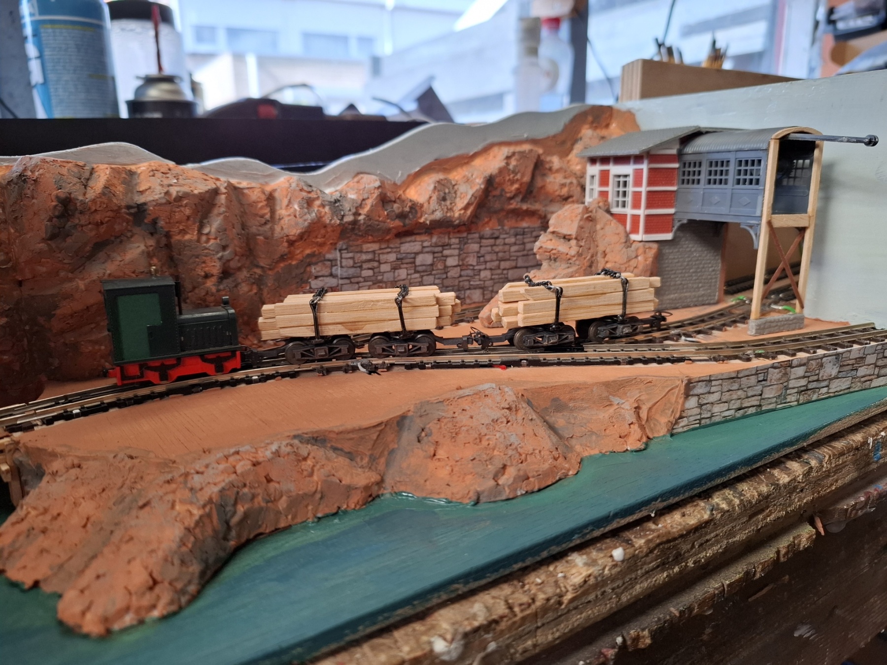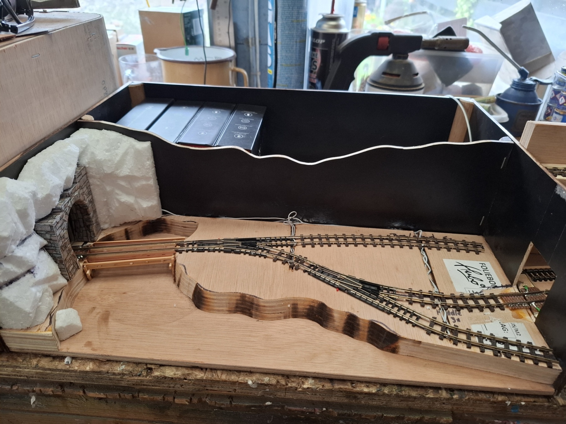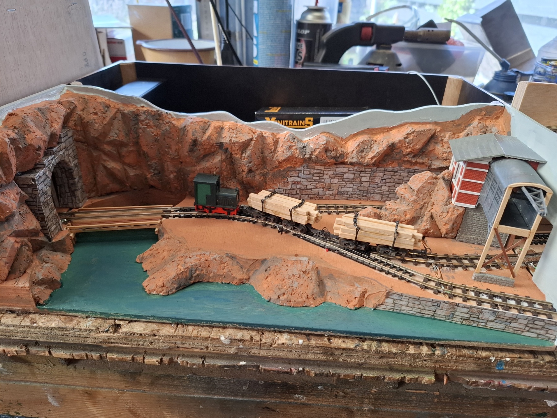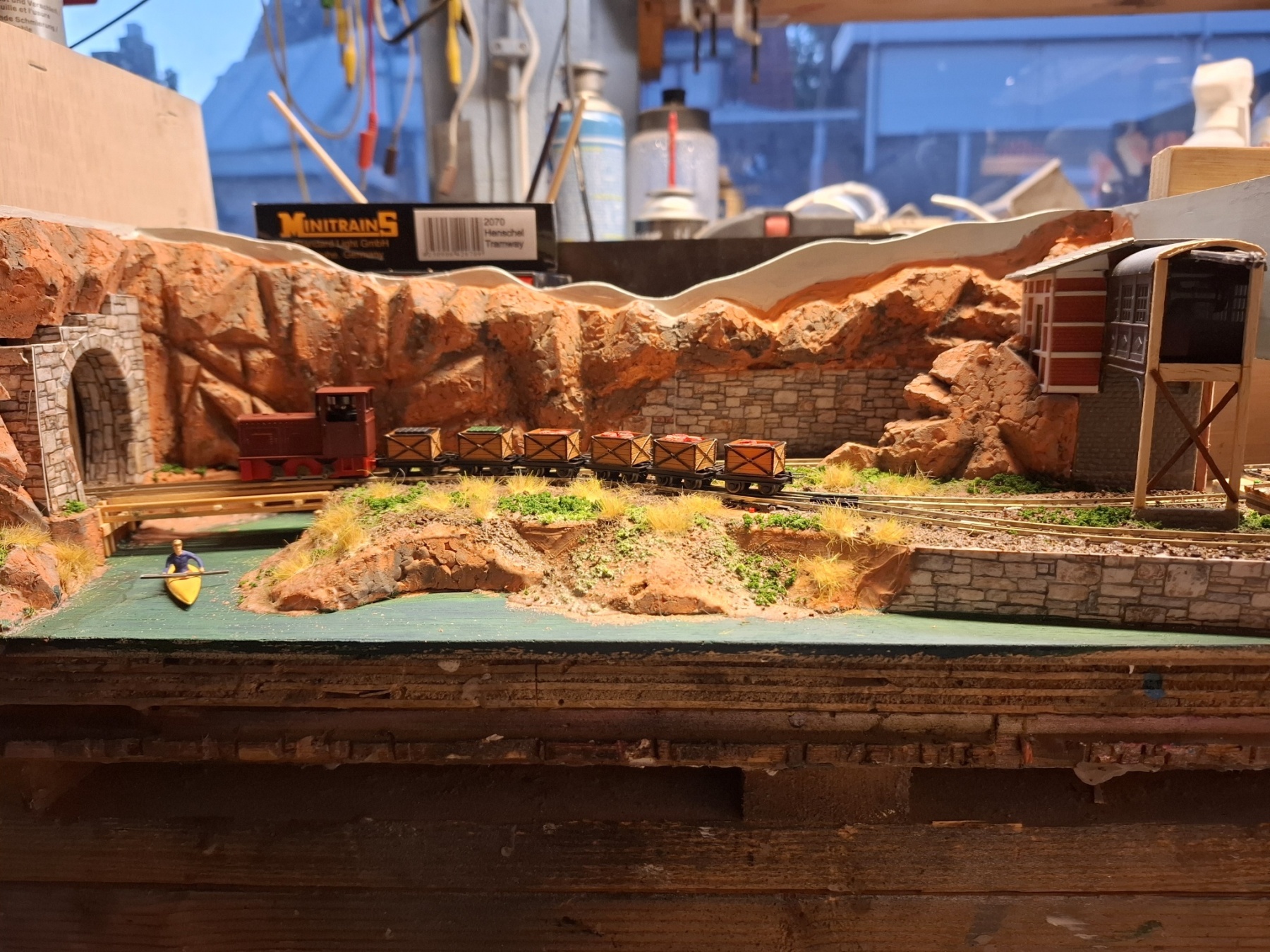 Als aanvulling op het piepkleine baantje Ile St. Ivre (staat ook hier in het 0,5m2 draadje) heb ik in een vergelijkbare kist een nog veel kleiner baantje gemeubeld waar ook al het materieel in opgeslagen kan worden. Achterin materieel en trafo, voorin een verlenging van de kustlijn met een spoor naar de wijnvelden van Padde Goût (verdwijnt tussen de rotsen), voorin een spoortje naar de kade van de vissersboot van Jaques Crousteaux, een lokale visser die ook af en toe een kreeft in zijn net heeft. Hij verkoopt zijn (bij) vangst op de markt die via de trein naar het dorp moet. De netten van het schip moeten opgehesen worden naar het loodsje boven de sporen, vandaar dat er een kraantje aan zit. De fiddleyard van Ile St. Ivre wordt gewoon hergebruikt en een positie opgeschoven.