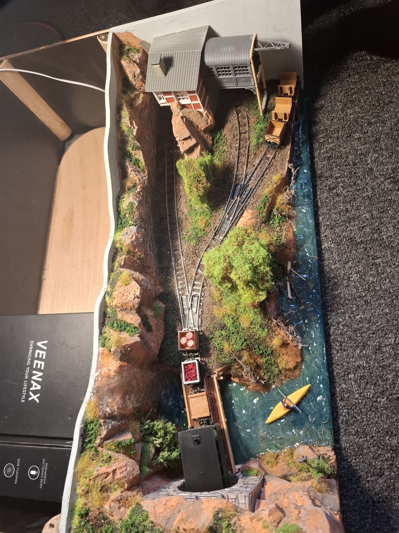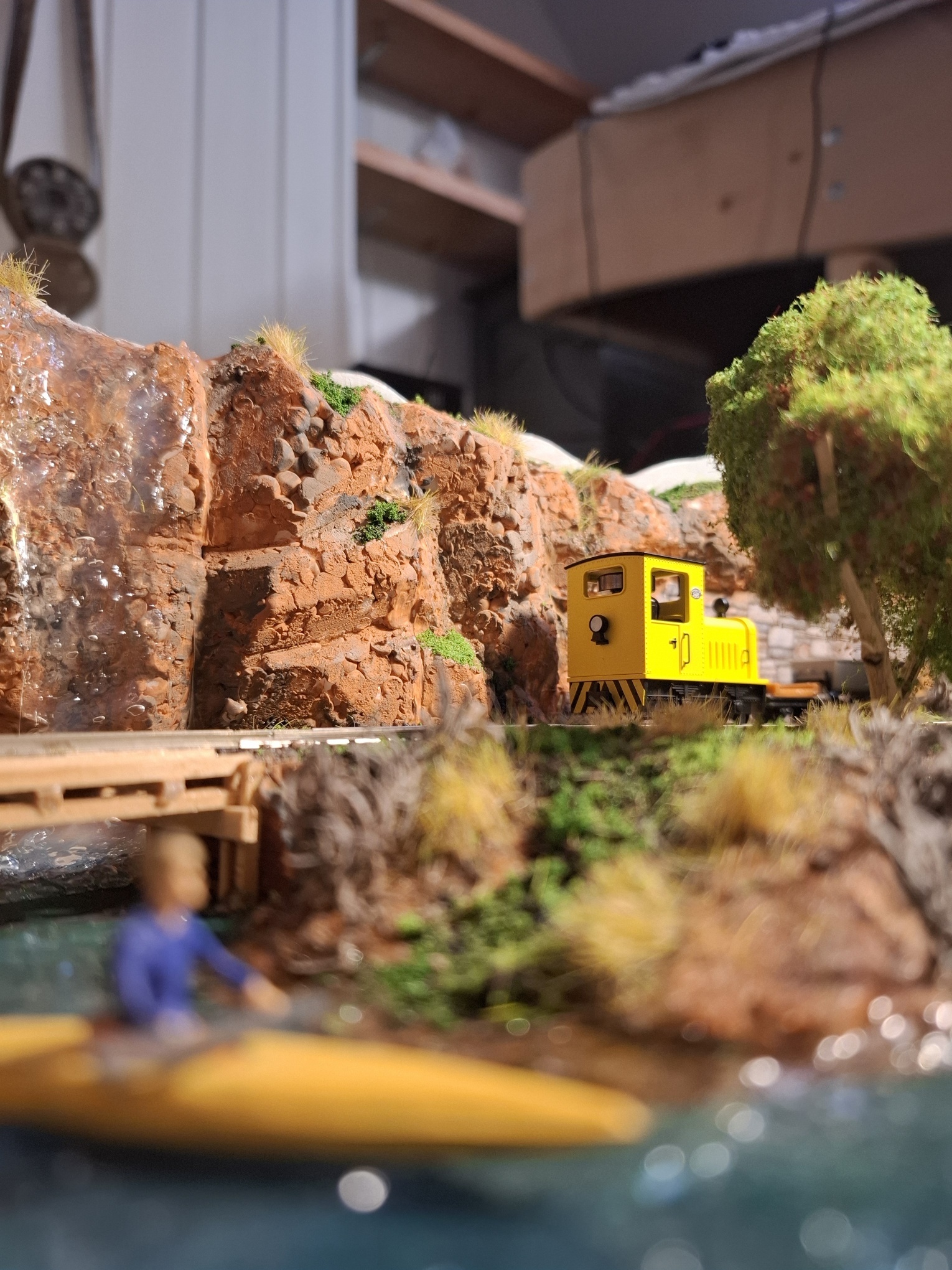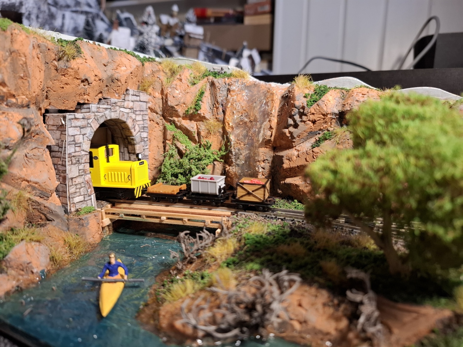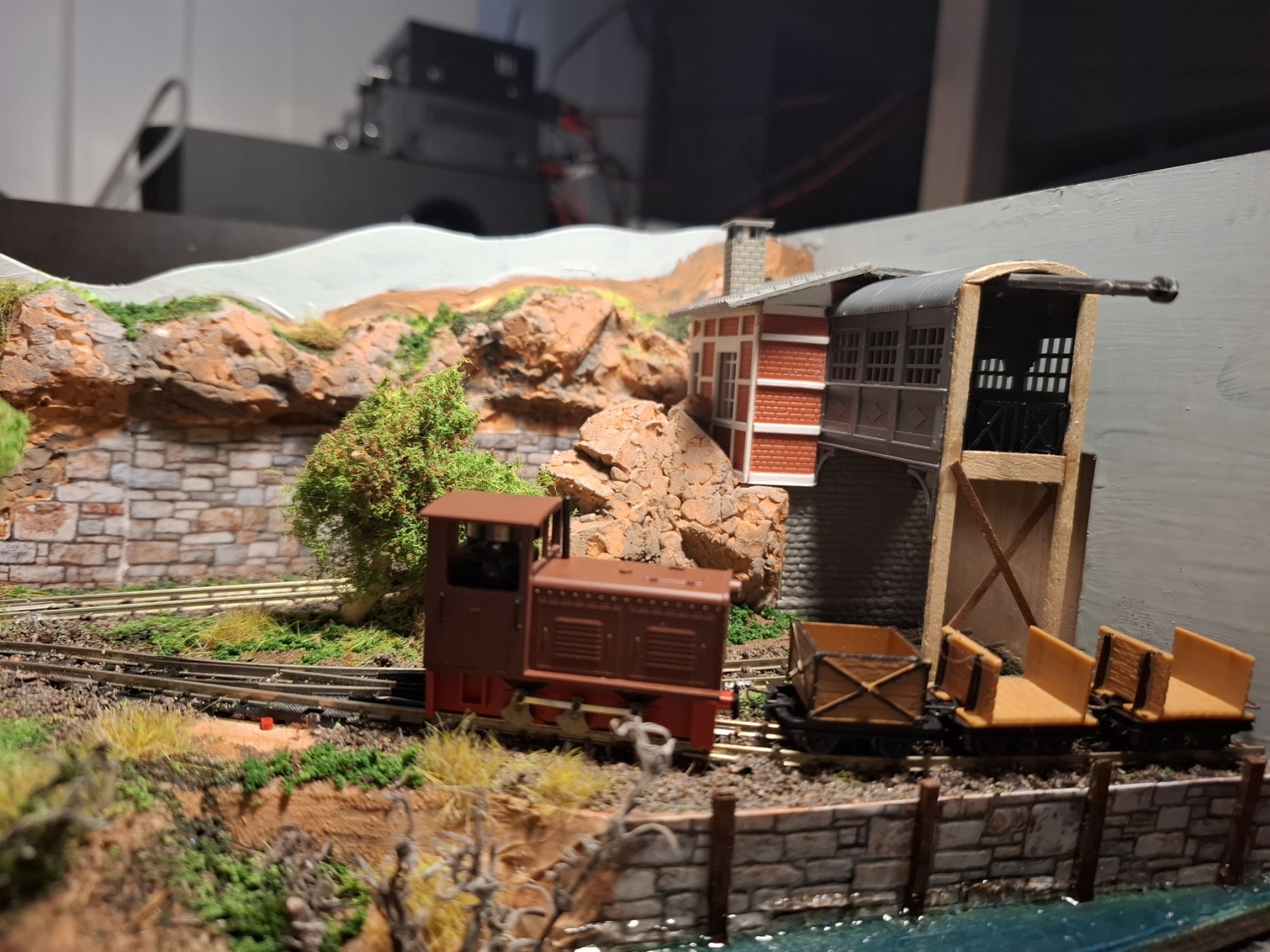 Als aanvulling op het piepkleine baantje Ile St. Ivre (staat ook hier in het 0,5m2 draadje) heb ik in een vergelijkbare kist een nog veel kleiner baantje gemeubeld waar ook al het materieel in opgeslagen kan worden. Achterin materieel en trafo, voorin een verlenging van de kustlijn met een spoor naar de wijnvelden van Padde Goût (verdwijnt tussen de rotsen), voorin een spoortje naar de kade van de vissersboot van Jaques Crousteaux, een lokale visser die ook af en toe een kreeft in zijn net heeft. Hij verkoopt zijn (bij) vangst op de markt die via de trein naar het dorp moet. De netten van het schip moeten opgehesen worden naar het loodsje boven de sporen, vandaar dat er een kraantje aan zit. De fiddleyard van Ile St. Ivre wordt gewoon hergebruikt en een positie opgeschoven.