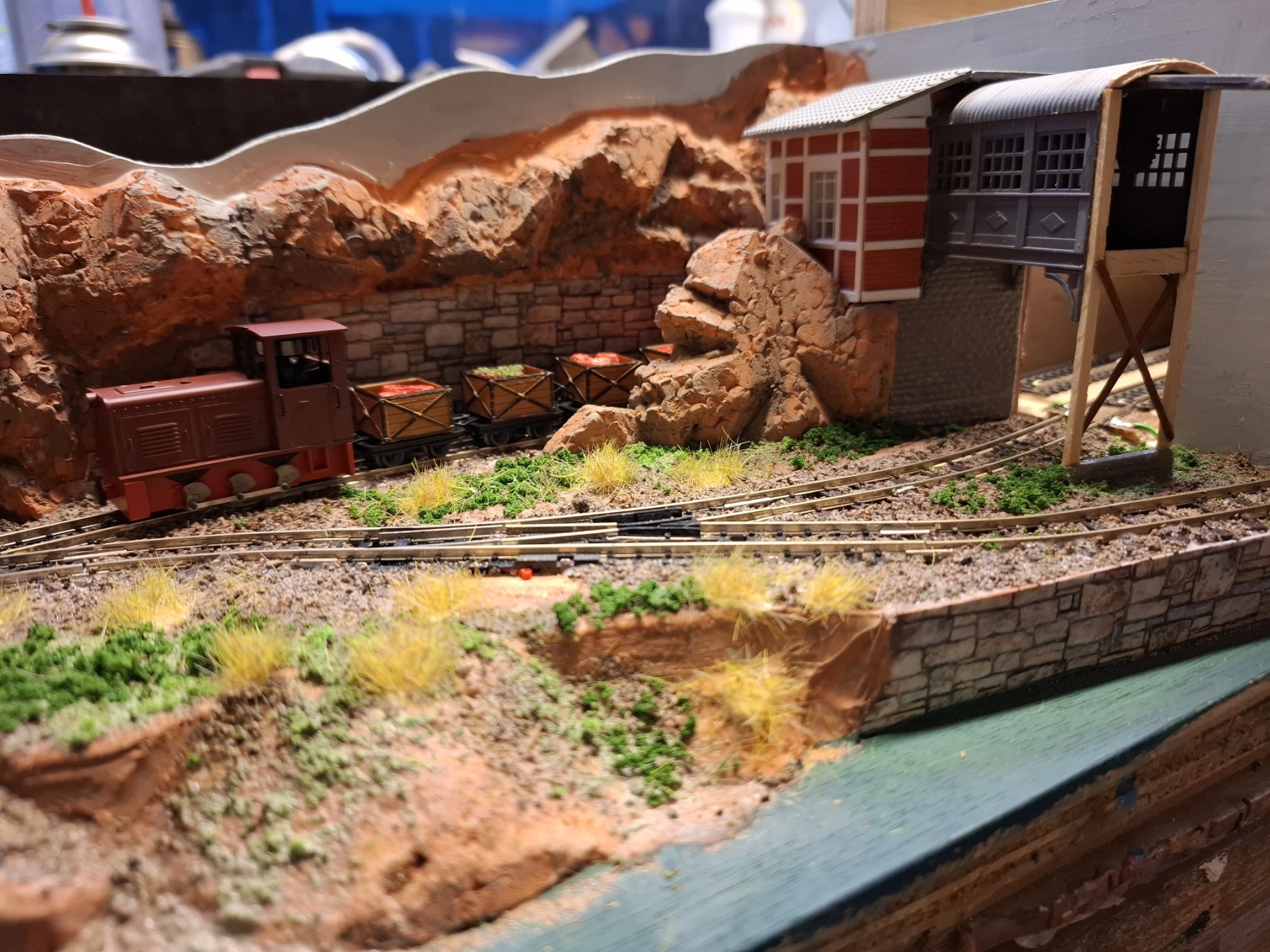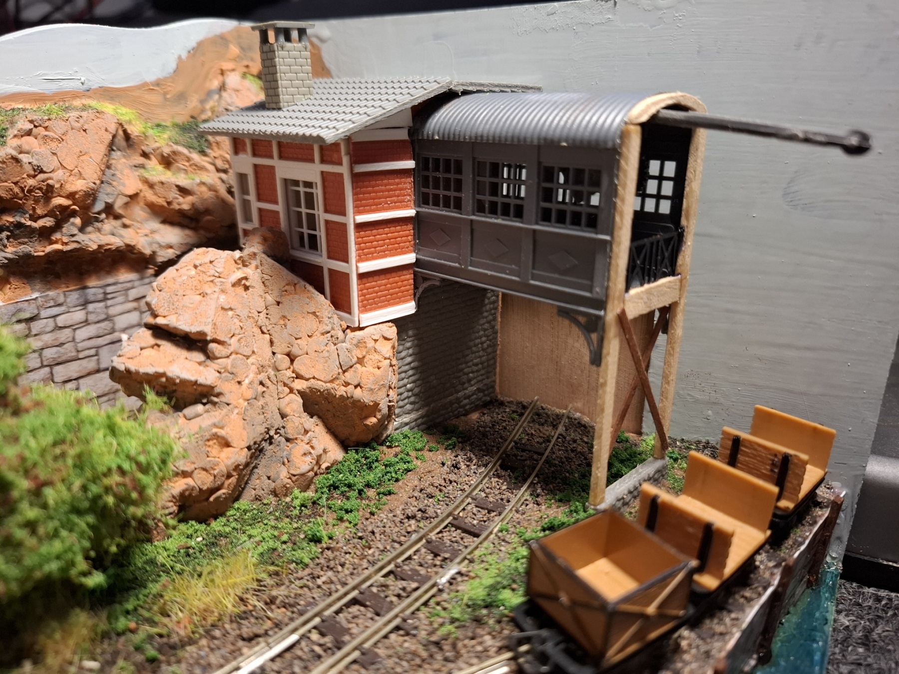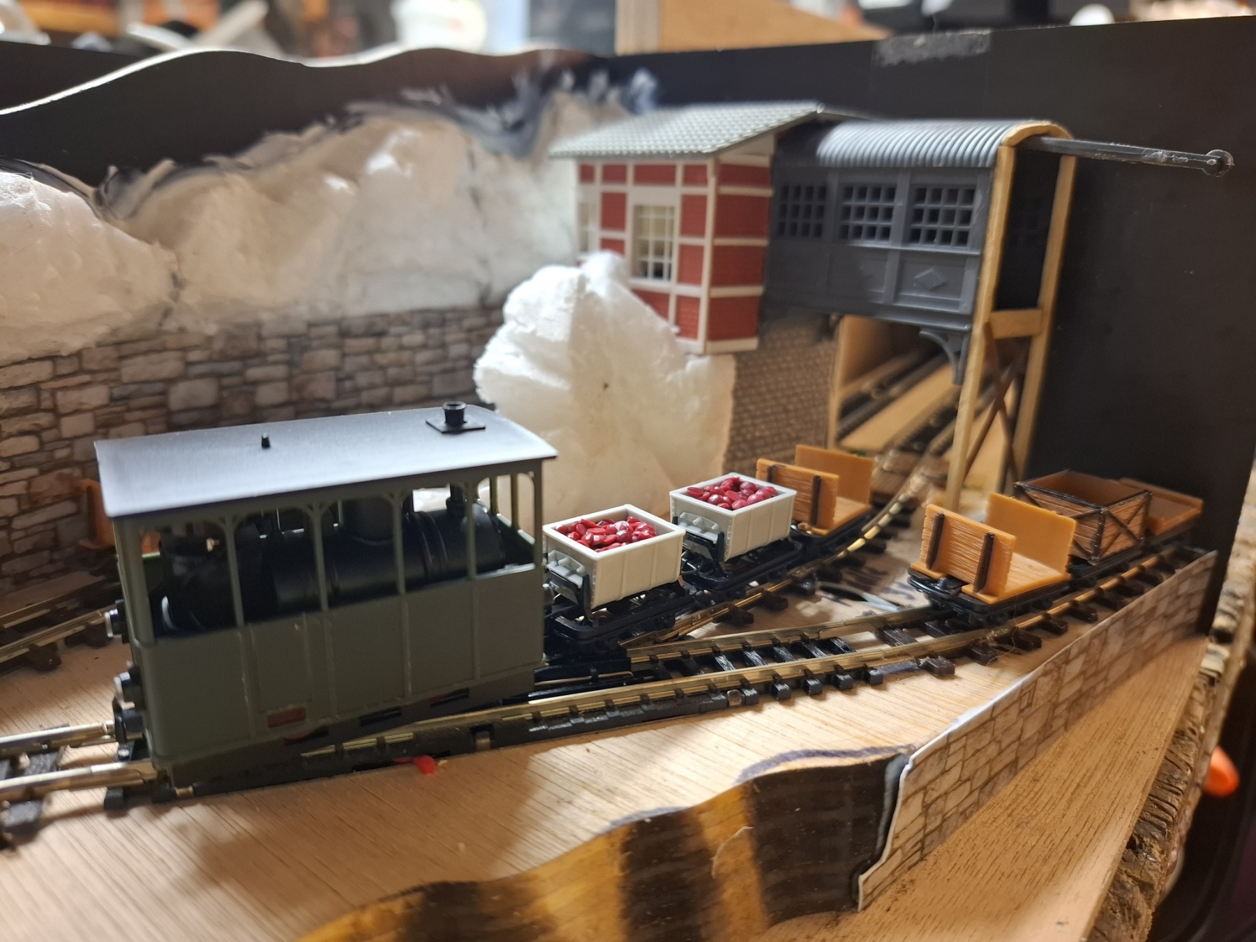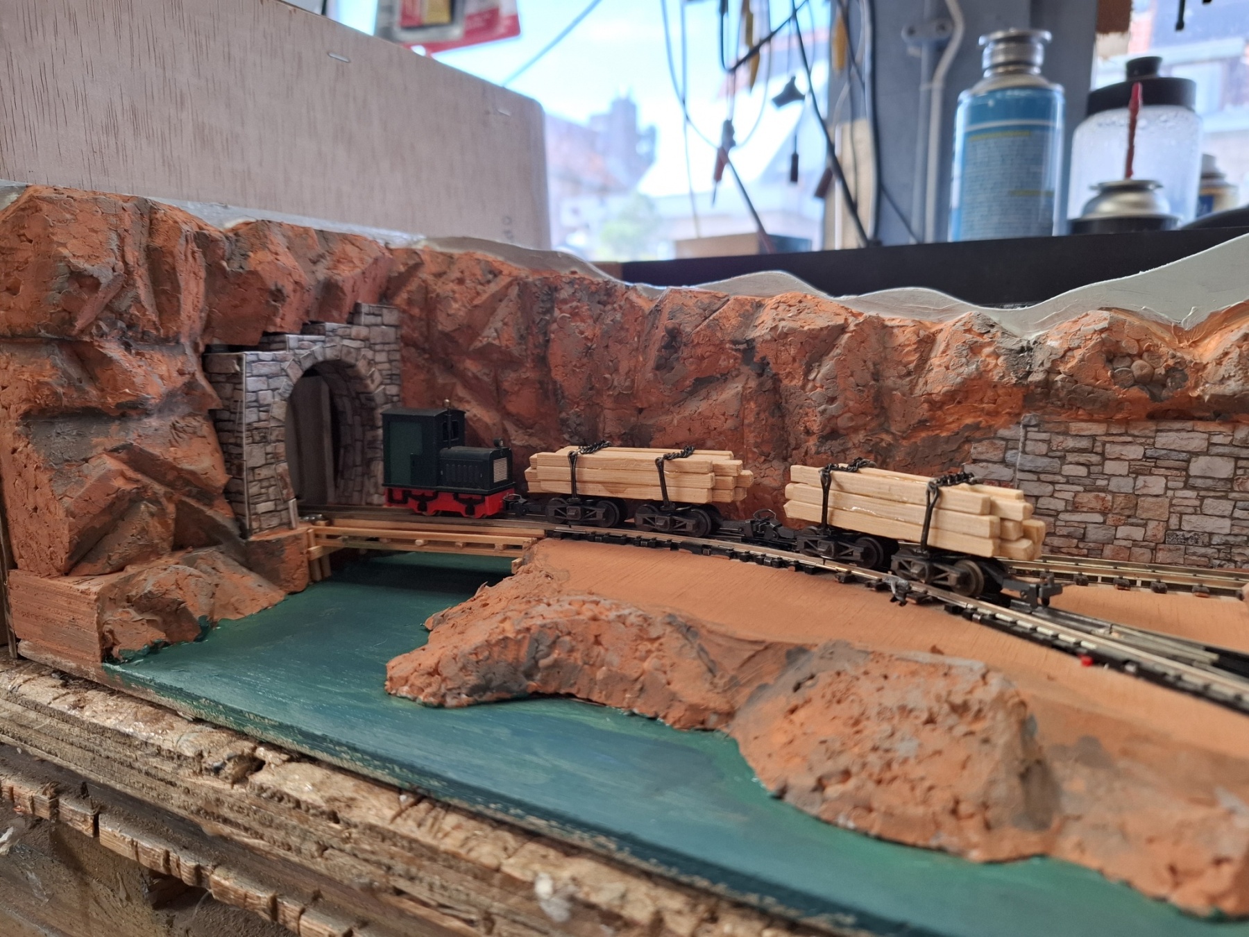 Als aanvulling op het piepkleine baantje Ile St. Ivre (staat ook hier in het 0,5m2 draadje) heb ik in een vergelijkbare kist een nog veel kleiner baantje gemeubeld waar ook al het materieel in opgeslagen kan worden. Achterin materieel en trafo, voorin een verlenging van de kustlijn met een spoor naar de wijnvelden van Padde Goût (verdwijnt tussen de rotsen), voorin een spoortje naar de kade van de vissersboot van Jaques Crousteaux, een lokale visser die ook af en toe een kreeft in zijn net heeft. Hij verkoopt zijn (bij) vangst op de markt die via de trein naar het dorp moet. De netten van het schip moeten opgehesen worden naar het loodsje boven de sporen, vandaar dat er een kraantje aan zit. De fiddleyard van Ile St. Ivre wordt gewoon hergebruikt en een positie opgeschoven.