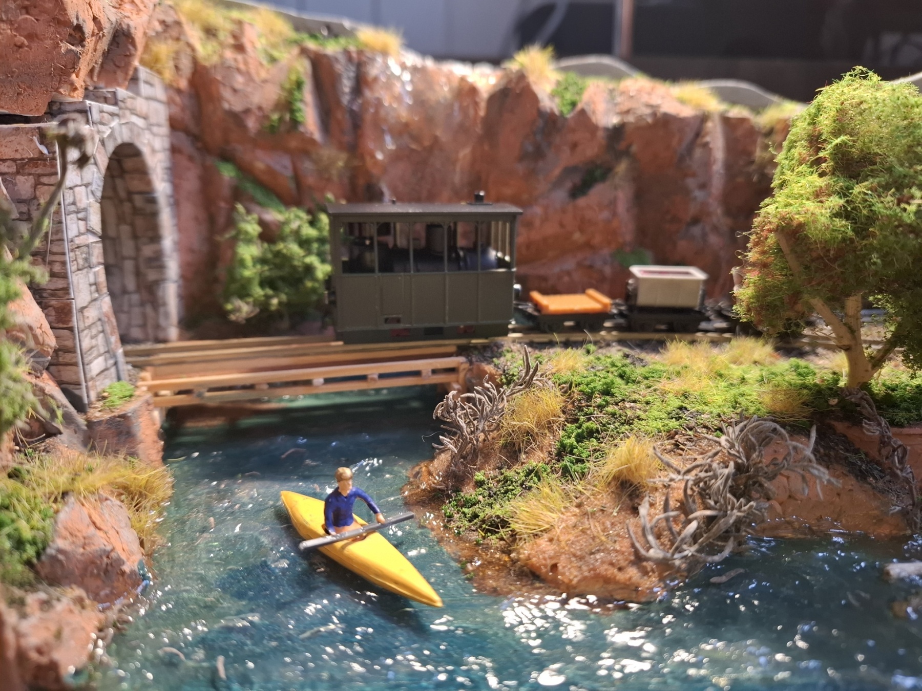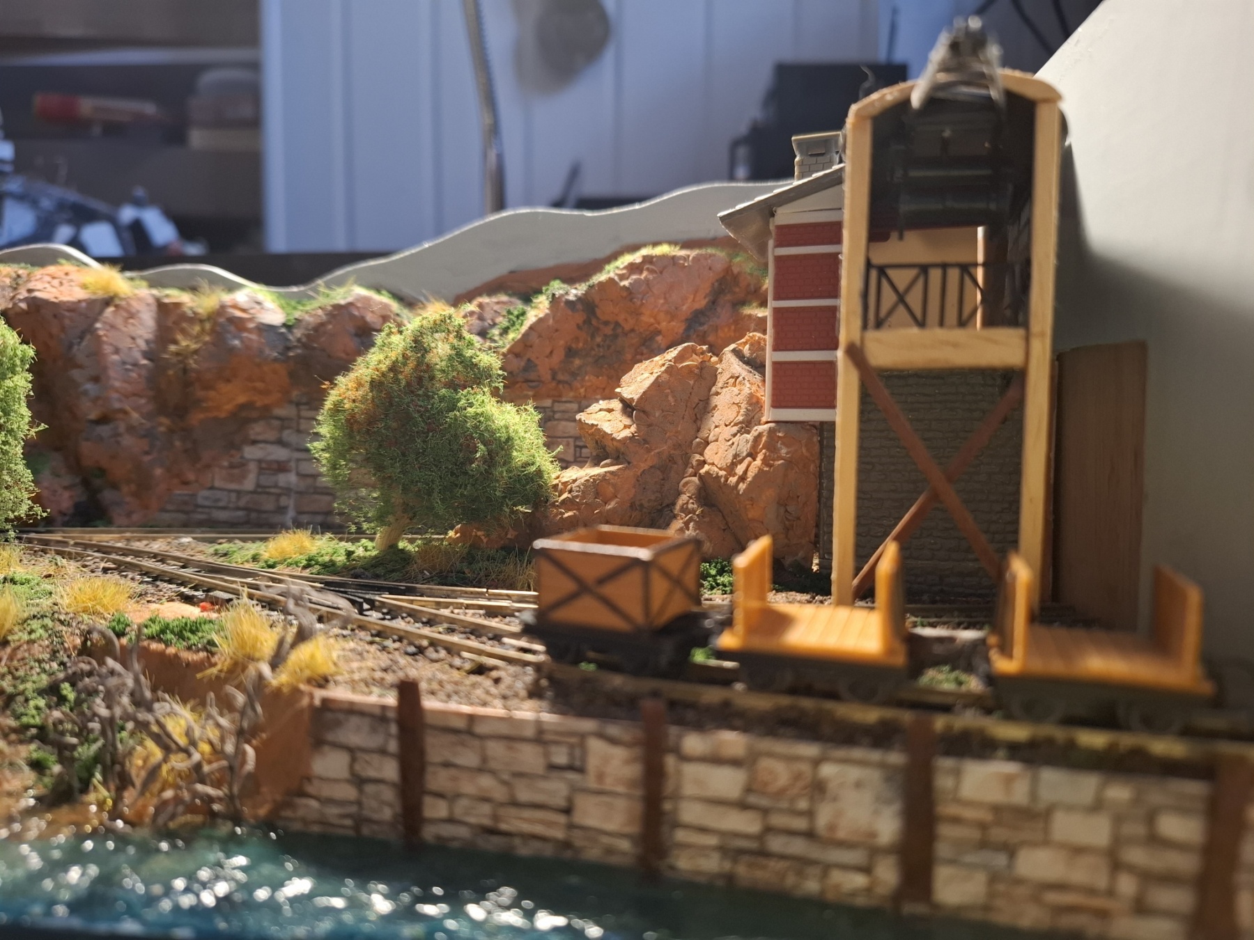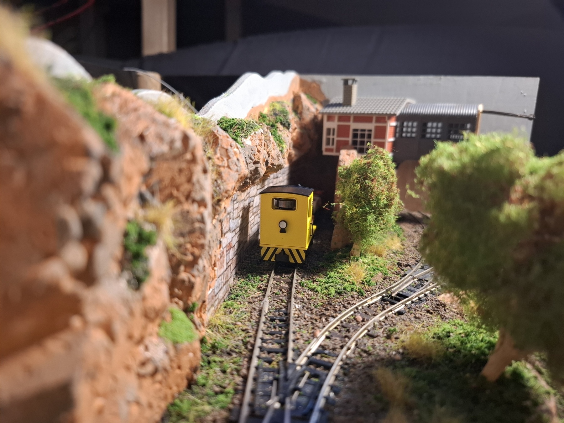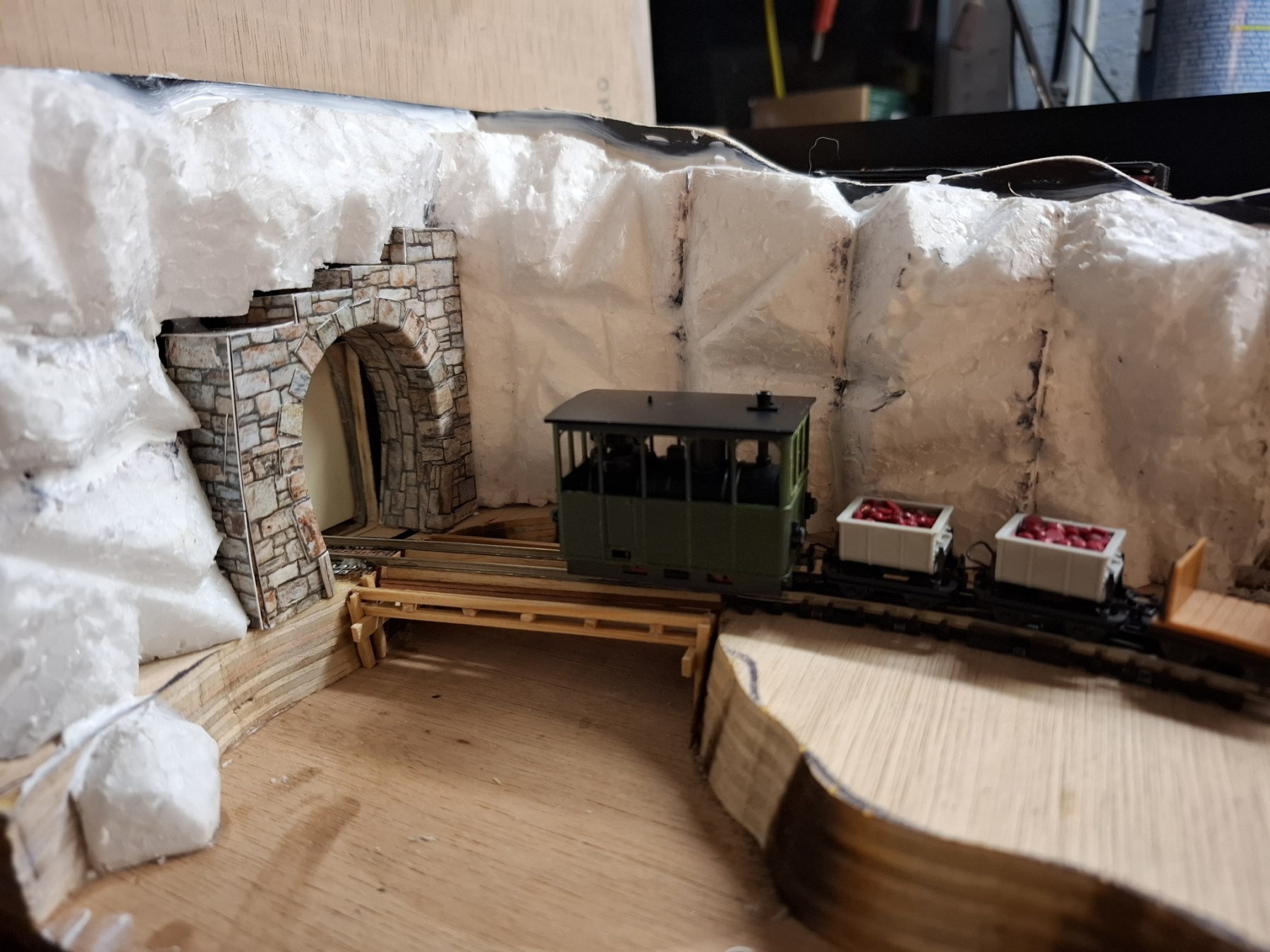 Als aanvulling op het piepkleine baantje Ile St. Ivre (staat ook hier in het 0,5m2 draadje) heb ik in een vergelijkbare kist een nog veel kleiner baantje gemeubeld waar ook al het materieel in opgeslagen kan worden. Achterin materieel en trafo, voorin een verlenging van de kustlijn met een spoor naar de wijnvelden van Padde Goût (verdwijnt tussen de rotsen), voorin een spoortje naar de kade van de vissersboot van Jaques Crousteaux, een lokale visser die ook af en toe een kreeft in zijn net heeft. Hij verkoopt zijn (bij) vangst op de markt die via de trein naar het dorp moet. De netten van het schip moeten opgehesen worden naar het loodsje boven de sporen, vandaar dat er een kraantje aan zit. De fiddleyard van Ile St. Ivre wordt gewoon hergebruikt en een positie opgeschoven.