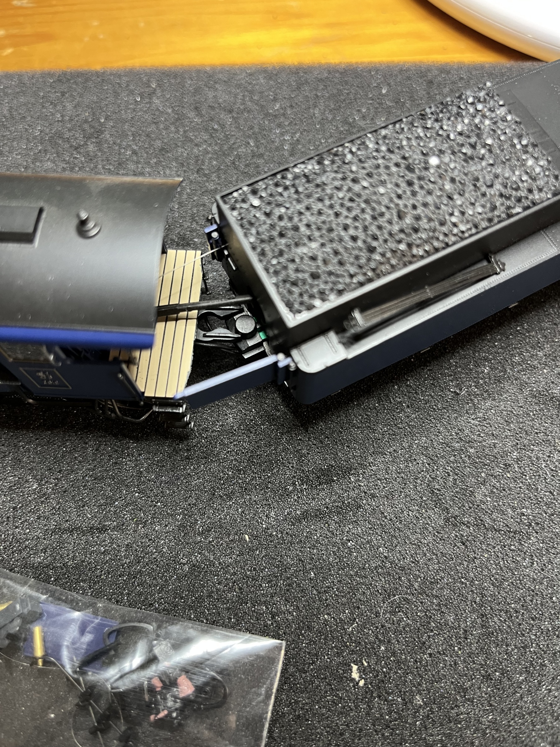 Bij het uit de piepschuimverpakking halen is de verbinding tussen loc en tender losgekomen.