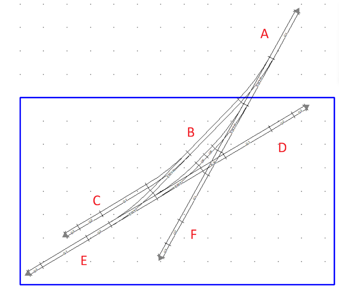 Je begint met een driewegwissel. Die zijn toch in de praktijk wat ontsporingsgevoeliger. Het is te overwegen waard om hier gewoon 2 gewone wissels voor te gebruiken.