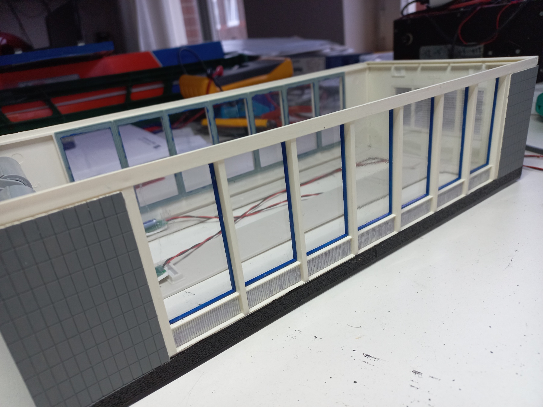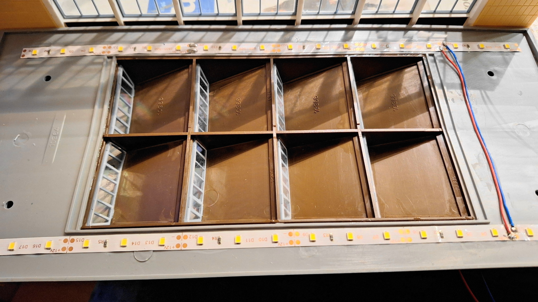 Dan nog een paar stukken lichtstrip tegen het dak lijmen en bedraden.