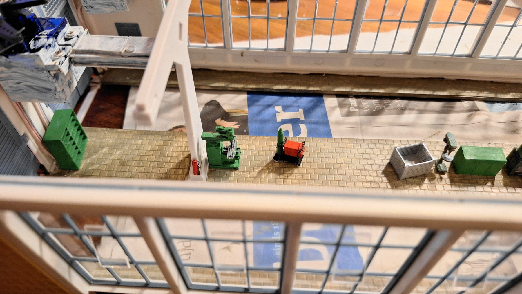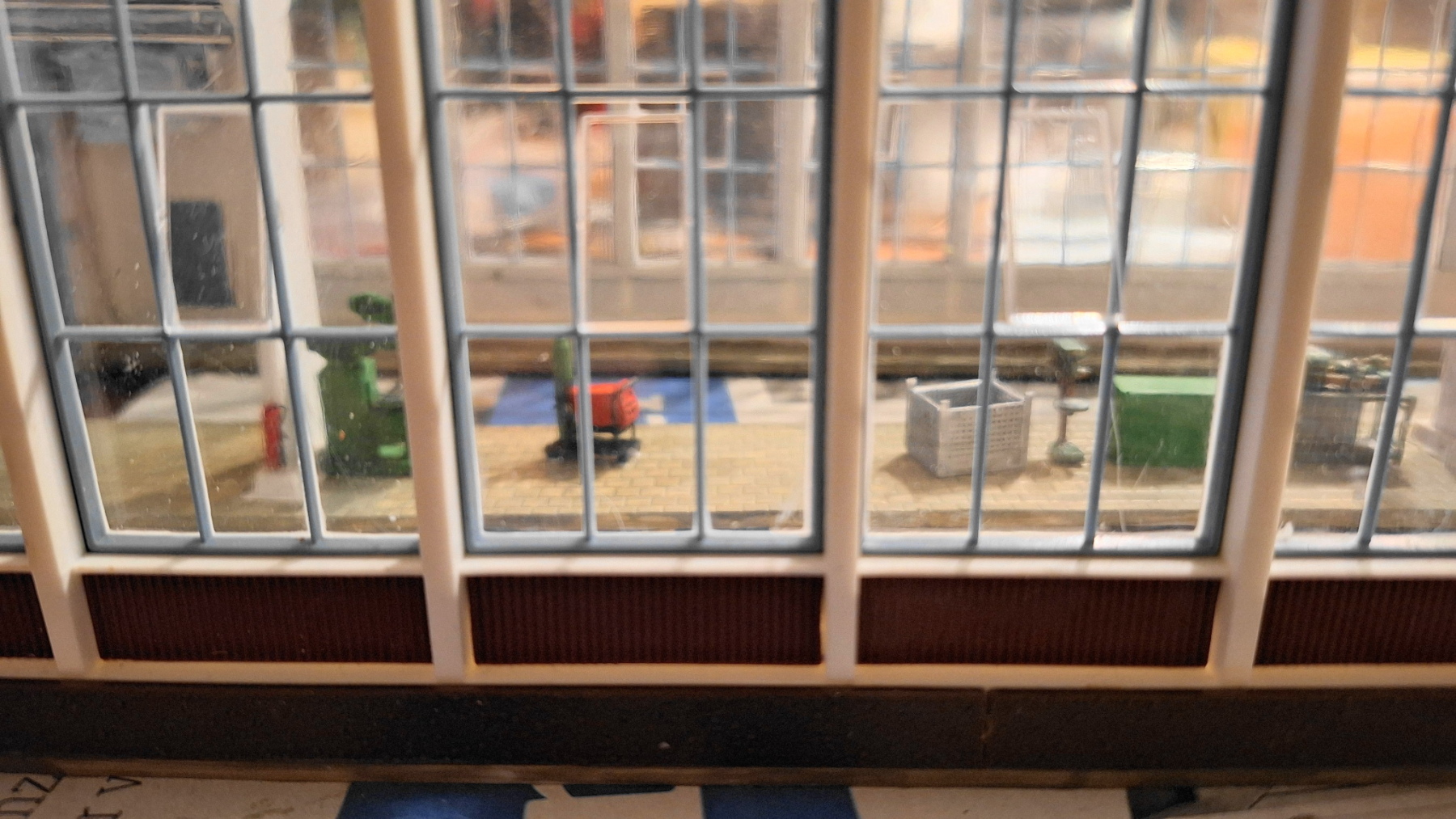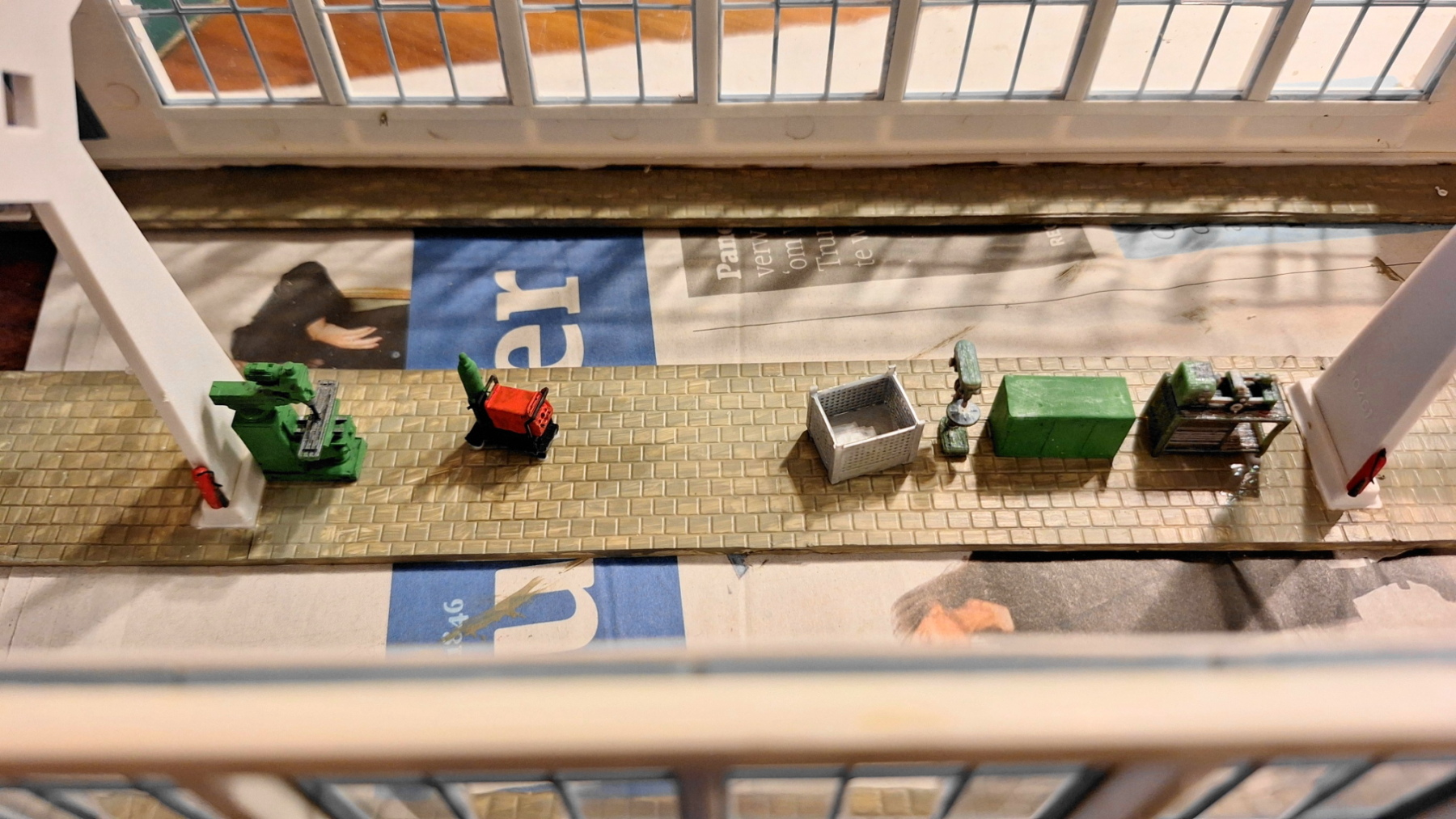 . Ook maar stoeptegels erin dan. Beetje lastig om te doen in een reeds gebouwde loods. Eerst maar een stukje papier pas maken, dan de plaat snijden en verlijmen...