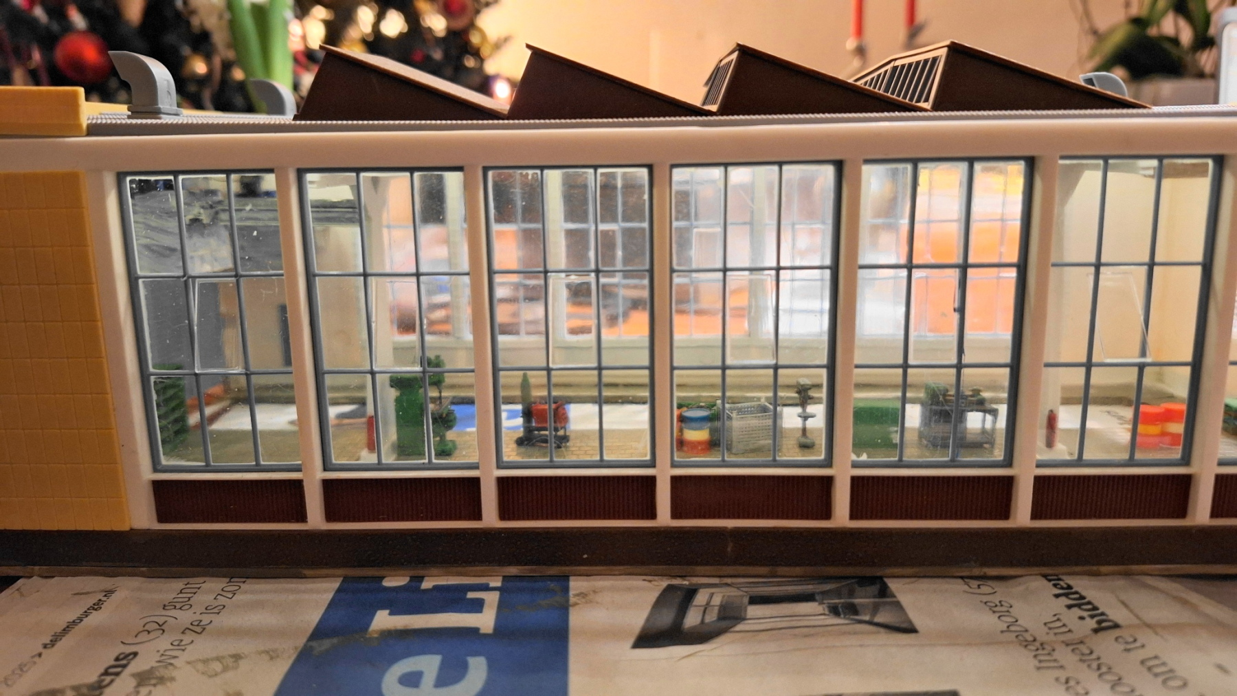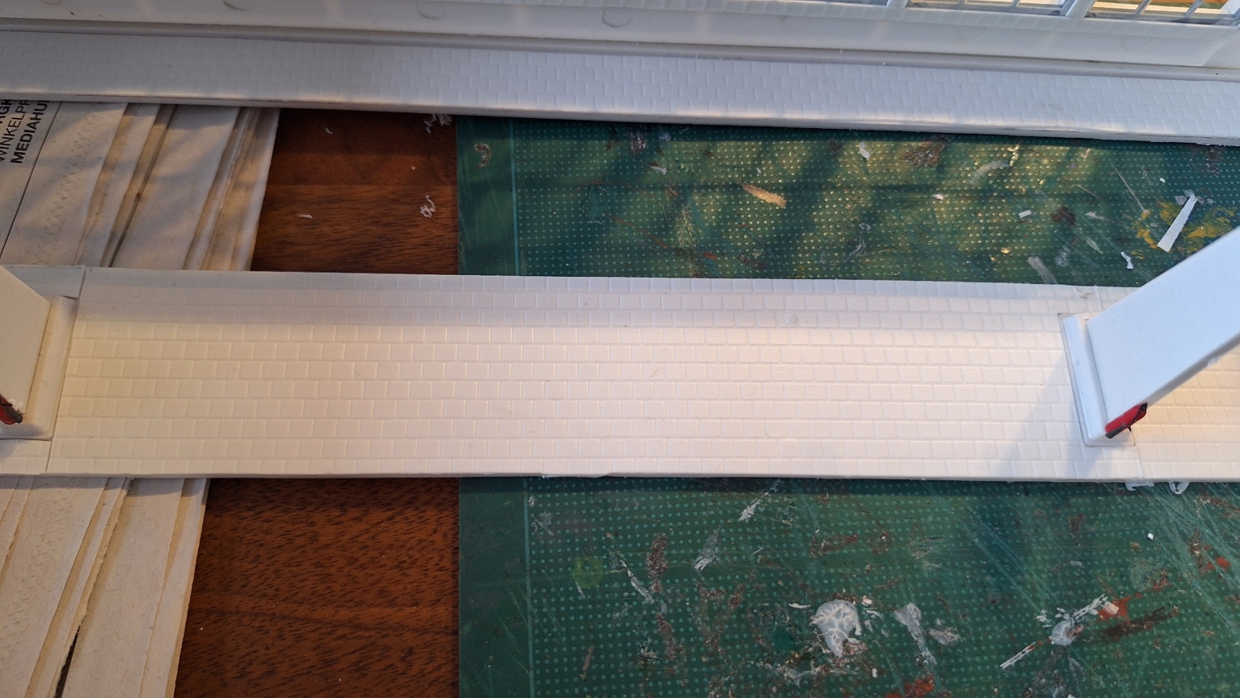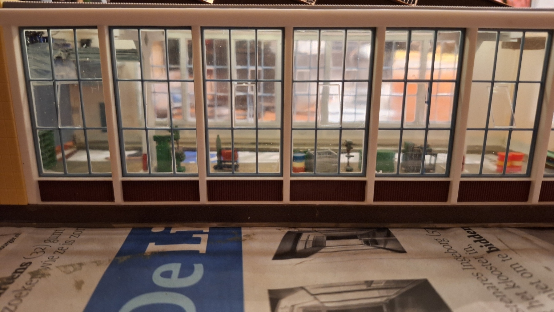 . Ook maar stoeptegels erin dan. Beetje lastig om te doen in een reeds gebouwde loods. Eerst maar een stukje papier pas maken, dan de plaat snijden en verlijmen...