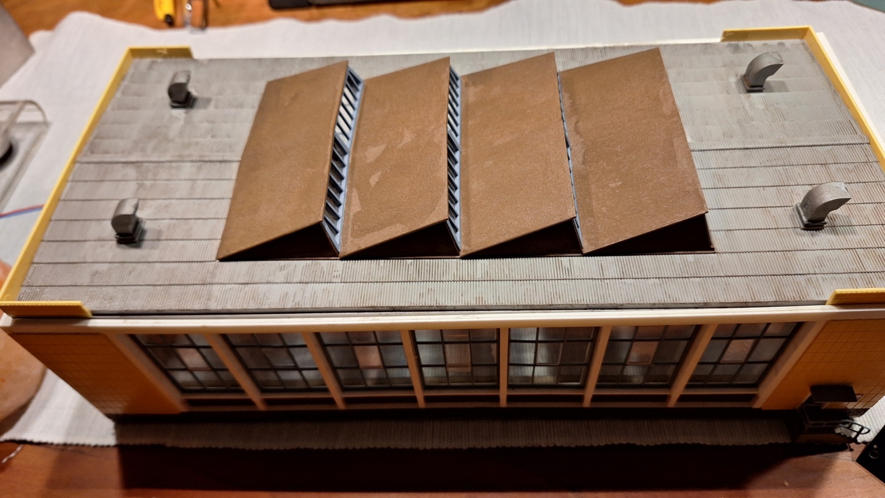 Nu het dak nog met een washje bruin en donker grijs behandelen. Zie nu op de foto dat het niet overal zit