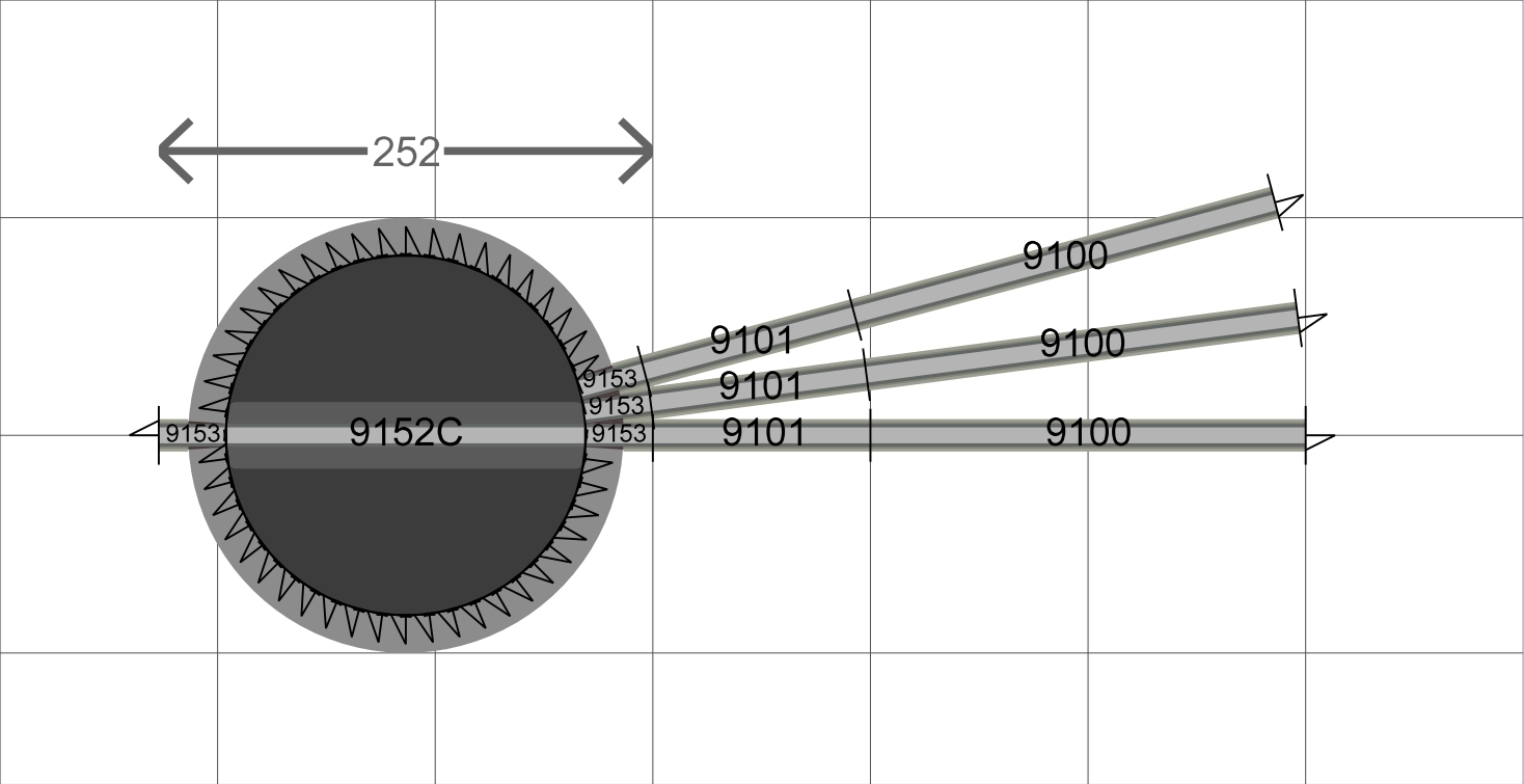 De diameter over de aansluitingen is 252 mm. Voor één Fleischmann loods zijn 3x 9101 en 3x 9100 nodig.