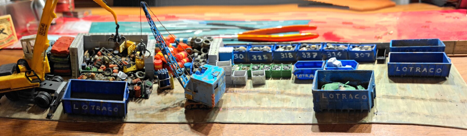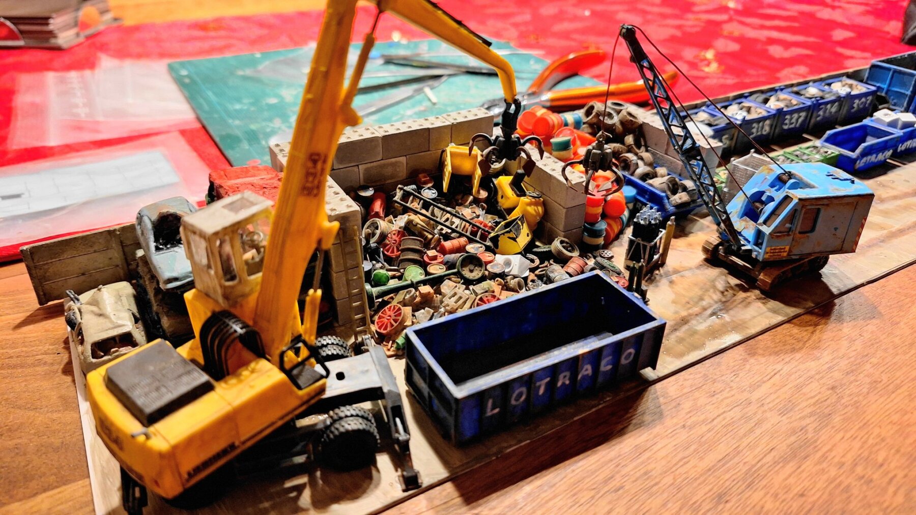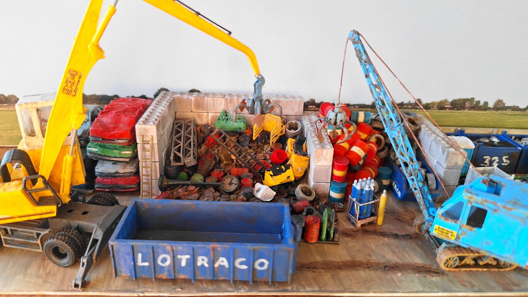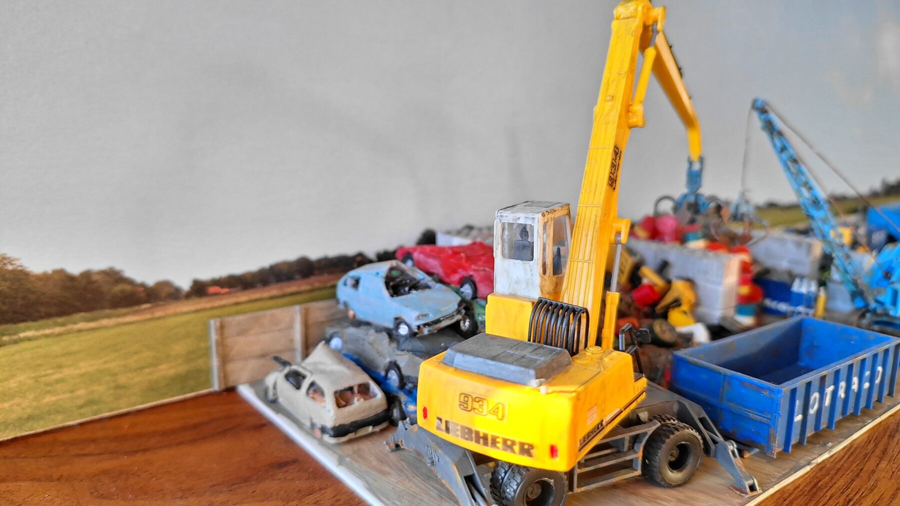 De Kibri Liebherr 934, met op de achtergrond geprinte sloopauto's. De beton lego blokken bakken met los schroot, vaten en draadrollen. De oude Adelheid Krupp kraan van Wiking als backup.